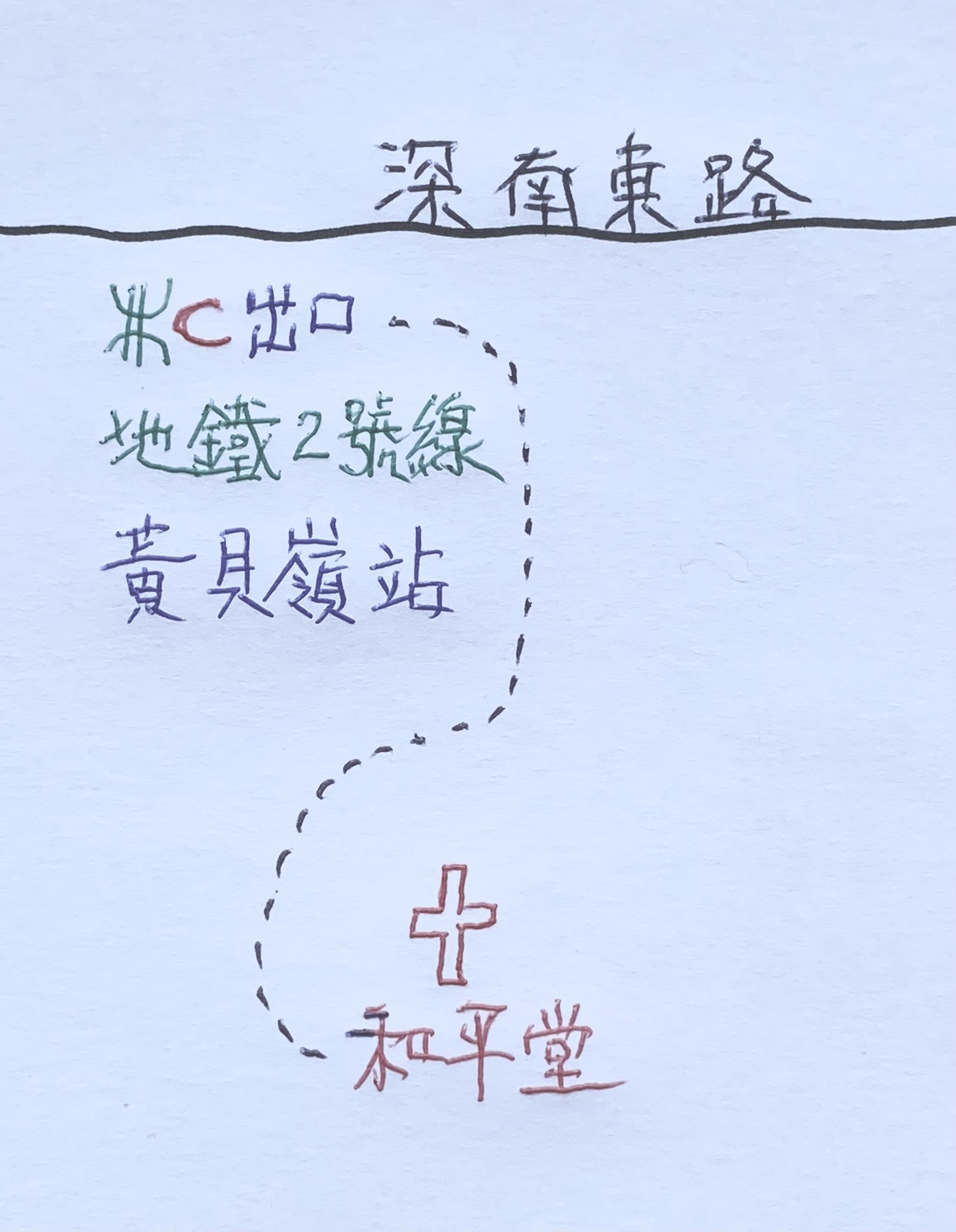 走上黃貝嶺站C 出口地面,一邊是整日車流不息的深南東路,身旁就是一個大屋苑的臨街樓宇。由高高樓房之間的小通道走入屋苑的內園,不消一分鐘之間,身前面對一棟獨立的三層樓房;是屋苑的六角形商場。一眼望去,見有超級市場、食店及零星服務行業;上面兩層多是教育機構。繞到這棟六角樓的另一邊看看,原來那裏才是商場的前庭,設計成屋苑的最闊大閑適小廣場。面向前庭,是這棟商場的最佳位置單位,竟是一間教會:「基督教和平堂」。