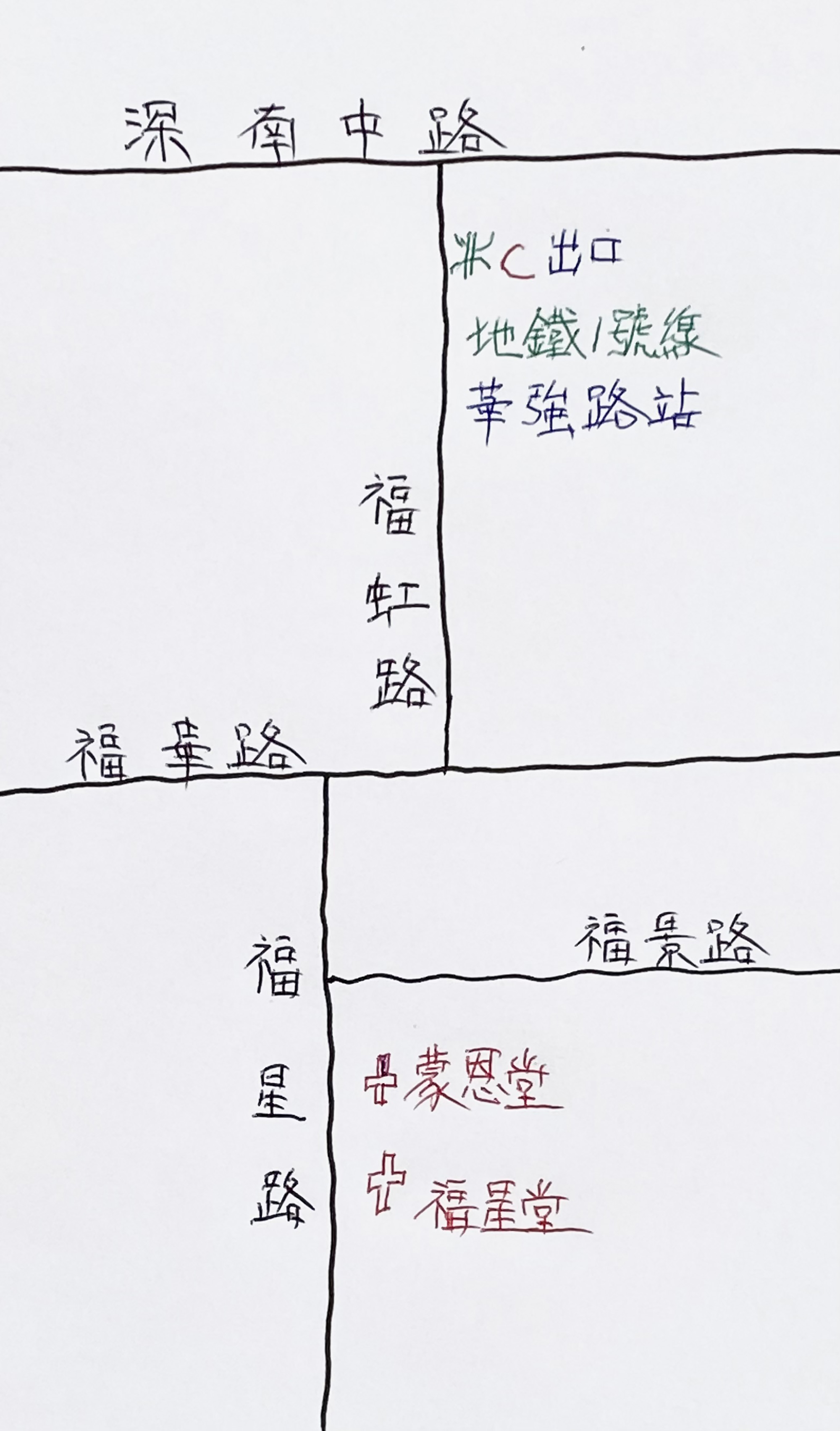 走上華強路站C 出口地面,旁邊是福虹路;依着本文附圖走,只需拐過兩個彎,大概十分鐘步程,就來到福星路旁的福星花園大厦。抬頭一覽這座大型物業,外牆竟有大字標示的兩間教會:基督教會蒙恩堂、基督教福星堂。