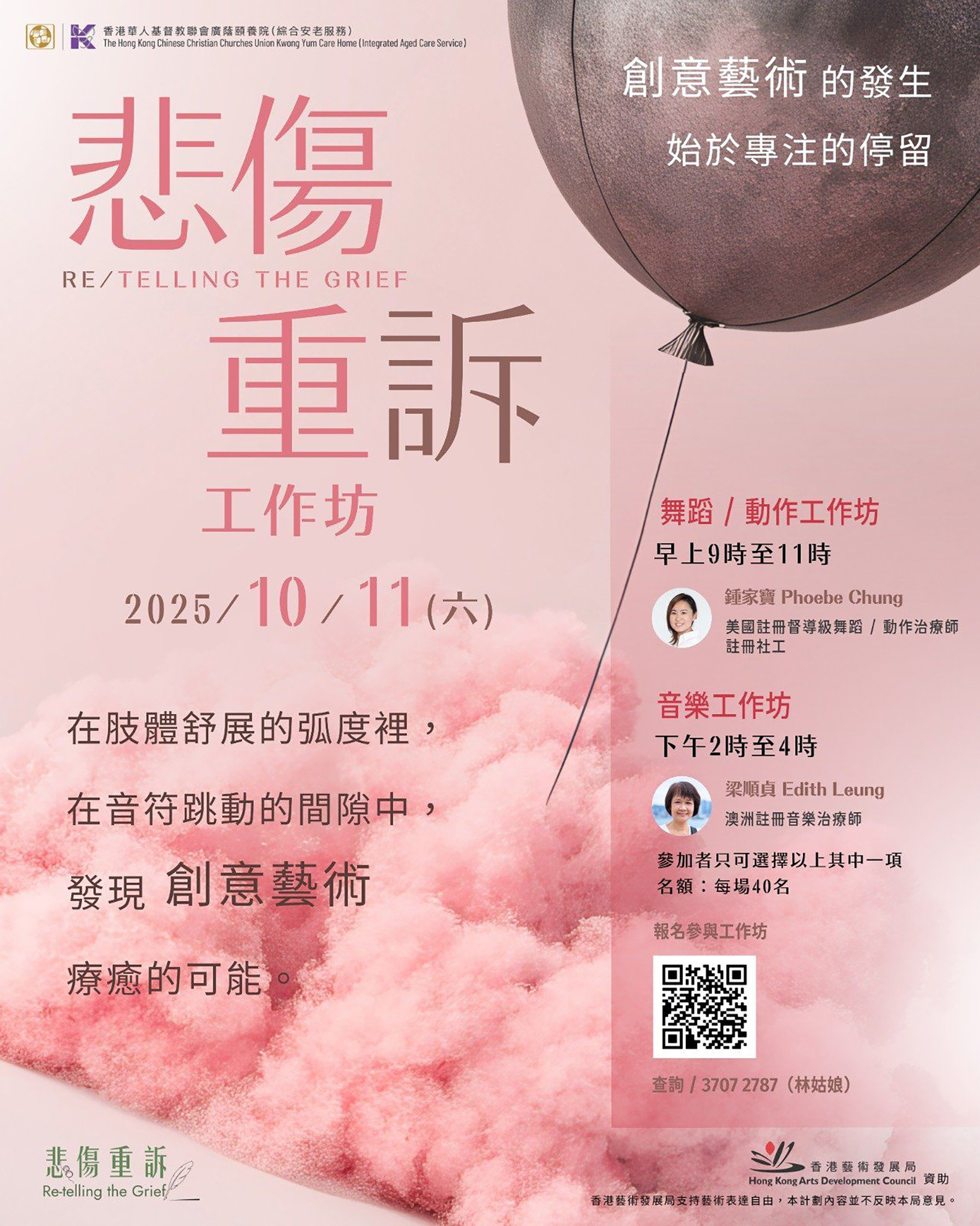 工作坊分兩部分進行,早上9時至11時為舞蹈/動作工作坊,由美國註冊督導級舞蹈及動作治療師、註冊社工鍾家寶(Phoebe Chung)主領;下午2時至4時為音樂工作坊,由澳洲註冊音樂治療師梁順貞(Edith Leung)主領。費用全免,歡迎對創意藝術有興趣的人士參與,每場設名額40名。截止報名日期為9月30日;報名詳情可參網頁https://hkcccu.kych.org.hk/zh-hant/news/events/68/;查詢可電3707-2787林姑娘。