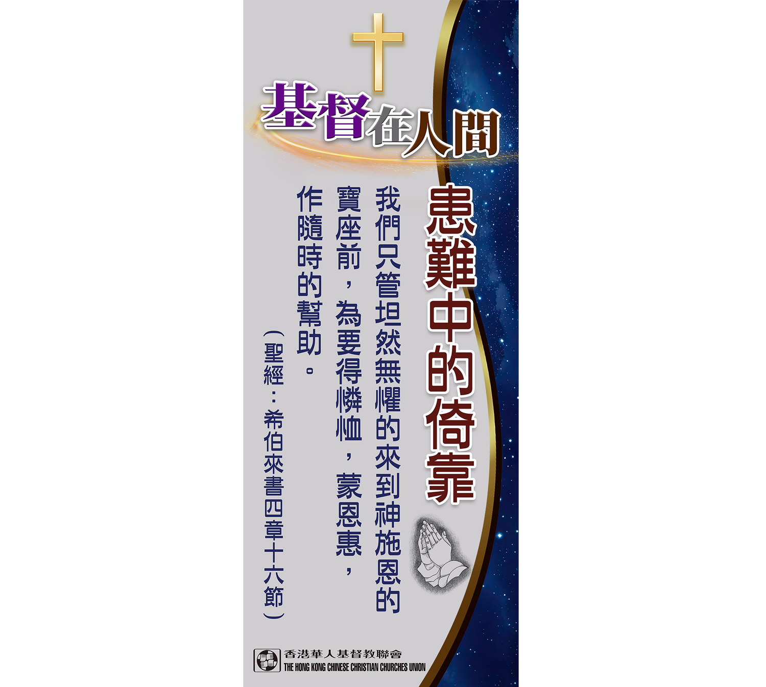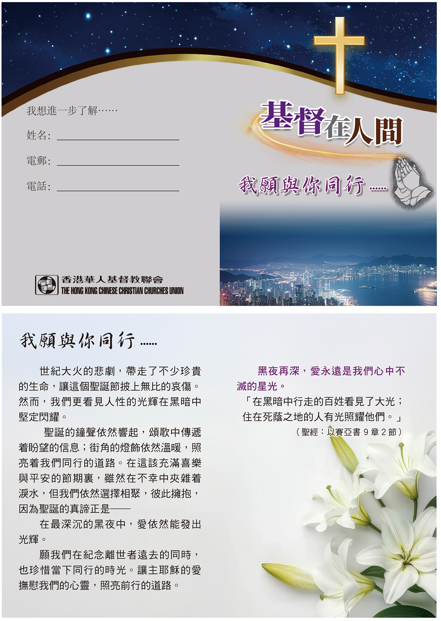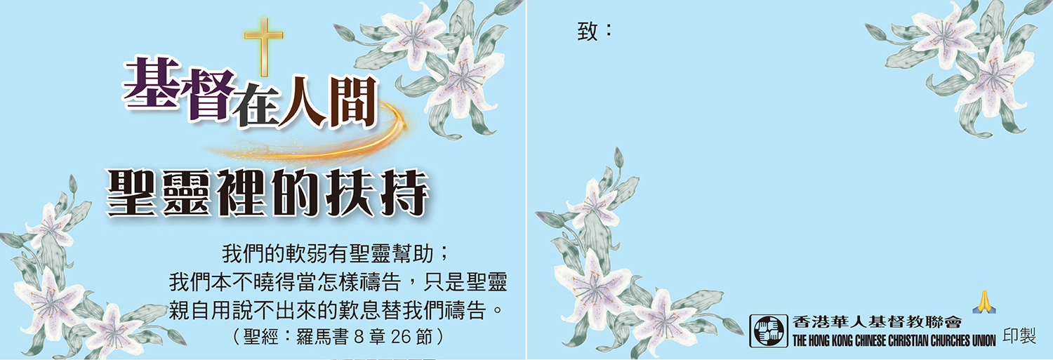 有見及此,香港華人基督教聯會特備心意咭、福音單張和易拉架等物資,透過聖經金句展現愛與安慰的信息,讓人在患難中看見從上帝而來的撫慰,向全港市民見證「基督在人間」。印刷製品可供堂會自由索取及派發,其中「基督在人間──我願與你同行」福音單張,亦會於全港分區聯合聖誕報佳音中派發,盼望市民明白聖誕的真諦──在最深沈的黑夜中,愛依然能發出光輝,以馬內利是不變的應許。