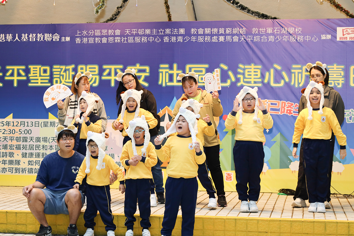另外,上水區亦於同日在天平邨露天廣場舉行「天平聖誕賜平安,社區心連心祈禱日」。聯會代表蘇振強牧師致辭時提及大埔宏福苑災情,他指仍感哀傷難過是必然,惟可把以後的事情交託上帝手中,因上帝叫人得着盼望。他遂於禱告中祈求上帝賜下安慰和醫治,讓身在黑暗痛苦之處的人看見盼望;讓身處驚惶憂慮中的生命得以平靜,為失去家園的居民開路;同時保守前線支援人員的身心狀態。他續言,聯會冀能凝聚各區教會的力量,讓一眾街坊明白節日的真正意義,同得基督的愛;因聖誕原為紀念耶穌降生,更深層的意義是讓基督的愛在人心中閃耀,並一同見證基督在人間。當日大會除了安排一系列表演項目,為回應大埔災情並沈重的社會氛圍,現場設有「祈禱站」,為有需要的人彼此聆聽、代禱,以致經歷真實的平安與祝福。