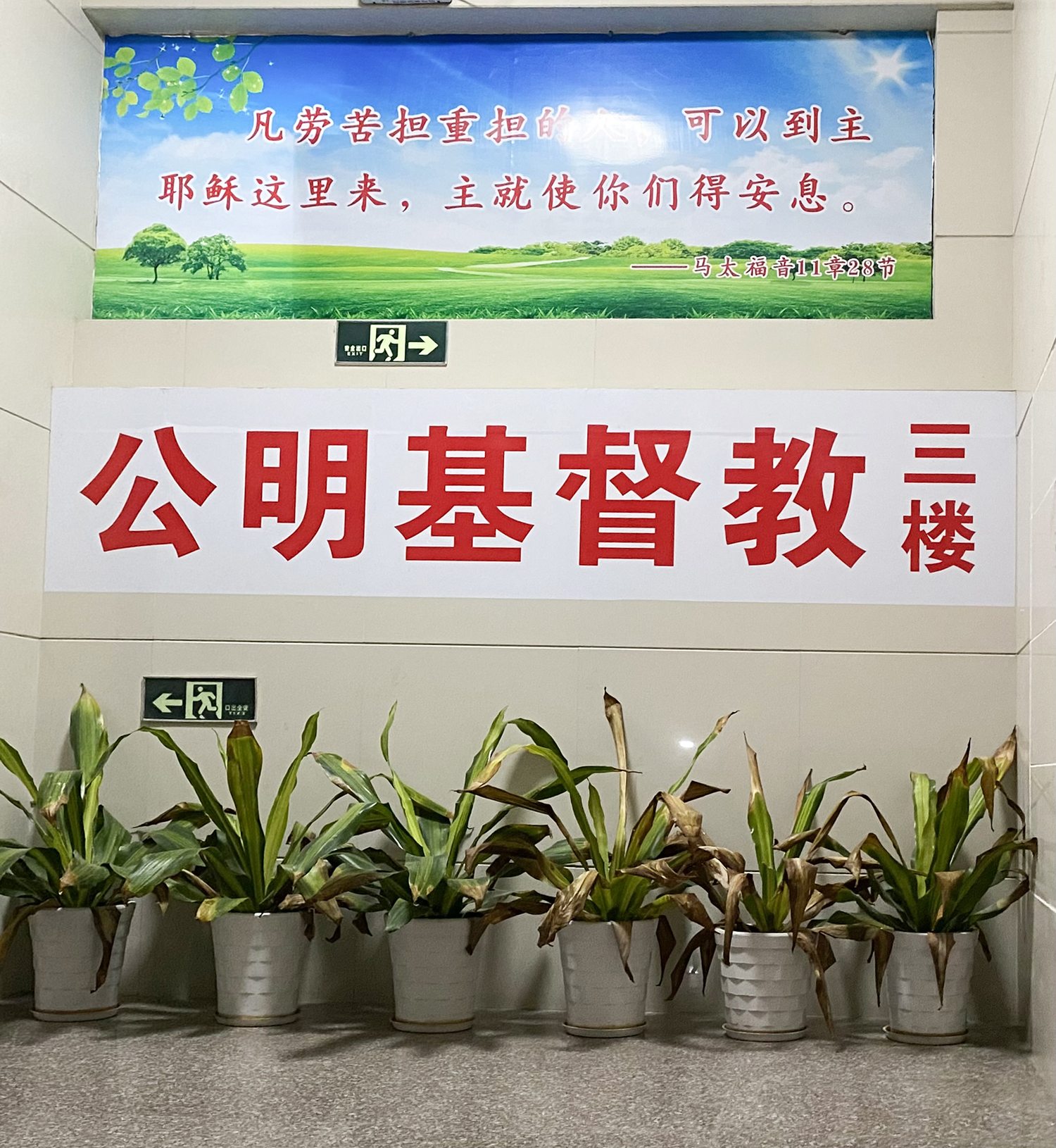 走上紅花山站 A2 出口,旁邊是別墅路;依着附圖所示的方位行走,轉兩個彎角就來到「深圳基督教公明堂」,大約是十五分鐘步程。這所堂會的日常通用名稱,堪稱百變。由所在的樓宇入口走上教會,一路見有「公明基督教」、「基督教公明教會」、「公明基督教會」等多種名稱。這大概是在堂會成長過程中的幾種口頭慣稱,一直留痕至今。