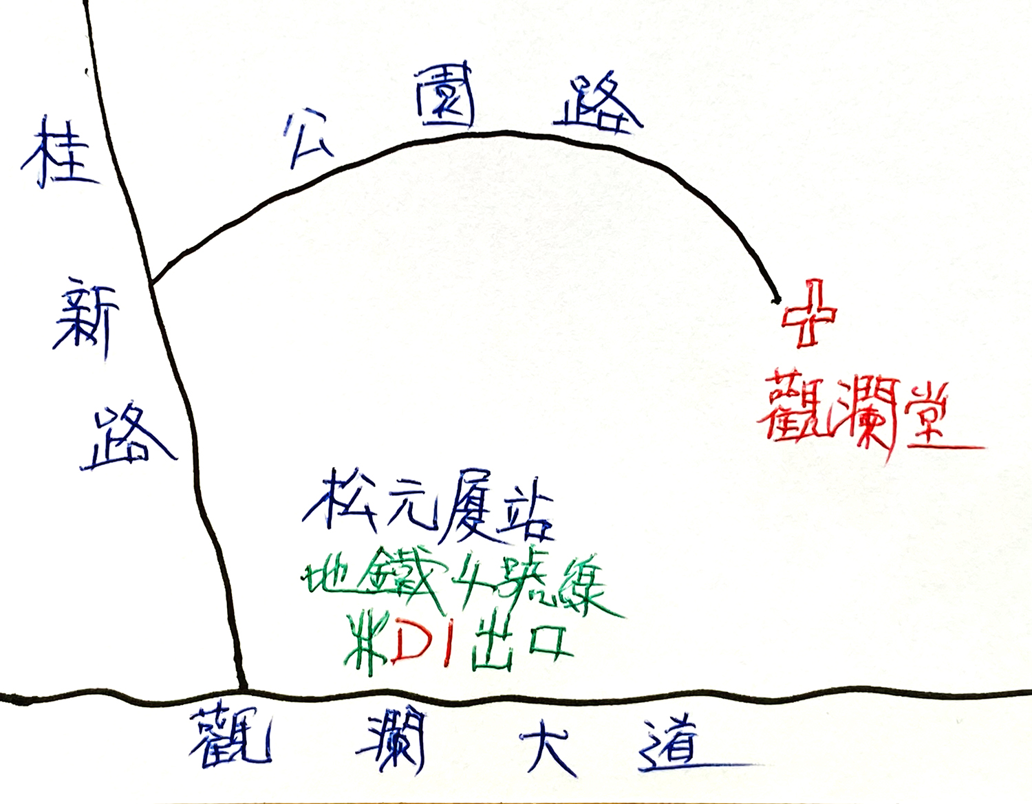 走上松元厦站D1出口地面,旁邊是觀瀾大道與桂新路的交界處。由這個位置環視四周,在交通繁雜的場景中,但見一座教堂矗立於旁邊的小山崗上;高大的紅色十架、配上十架之下同樣奪目的教會名牌,使「基督教觀瀾堂」成為這處街區的最矚目地標。依着附圖所顯示的路線,走上緩緩的小坡,大約十分鐘來到教堂門前。