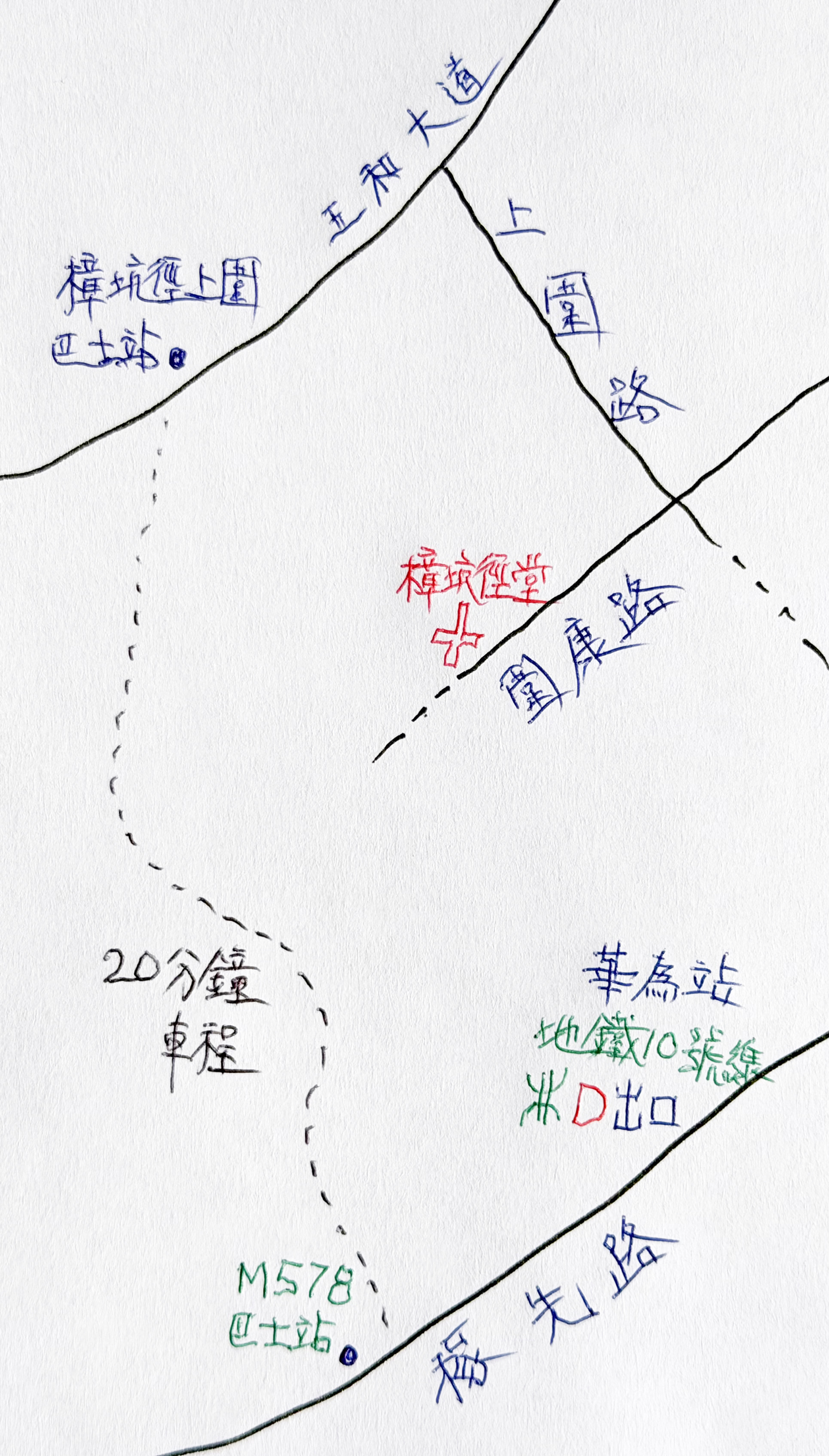 沿着稼先路走三分鐘就來到汽車站,由這裏乘搭 M578路車,朝樟坑徑總站方向行駛,大約二十分鐘車程,到了樟坑徑上圍站下車。依着本文附圖所示走,只需拐兩個彎,大約十分鐘步程,就來到「基督教樟坑徑堂」。