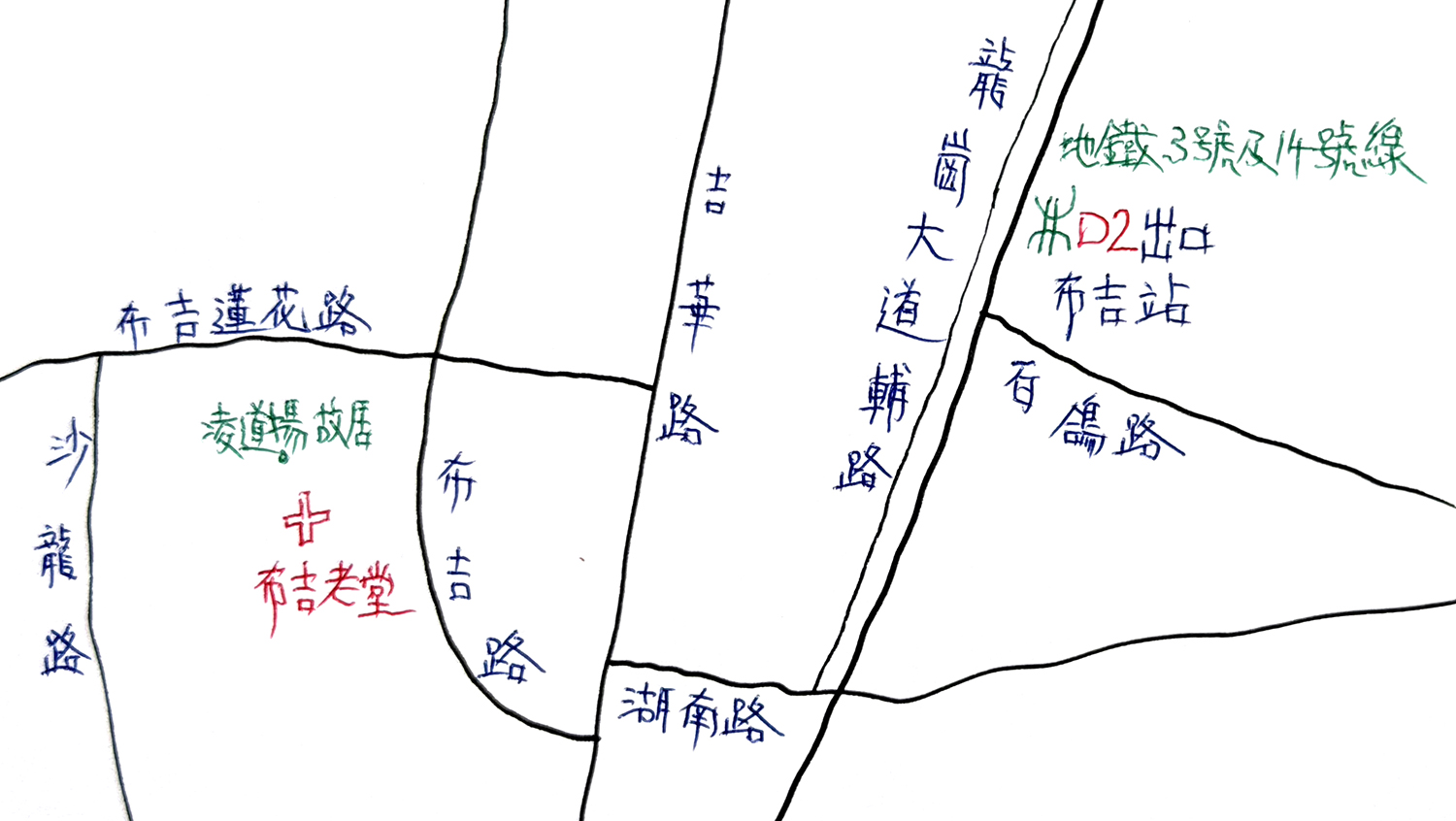 由布吉站D2 出口上到地面,旁邊是龍崗大道。依着本文附圖所示,大約十分鐘步程去到布吉路街口。沿着布吉路走一小段,就見行人路旁立着一塊大碑:「凌道揚故居」。由這碑旁邊的橫街走去,幾分鐘就來到「基督教布吉老堂」。