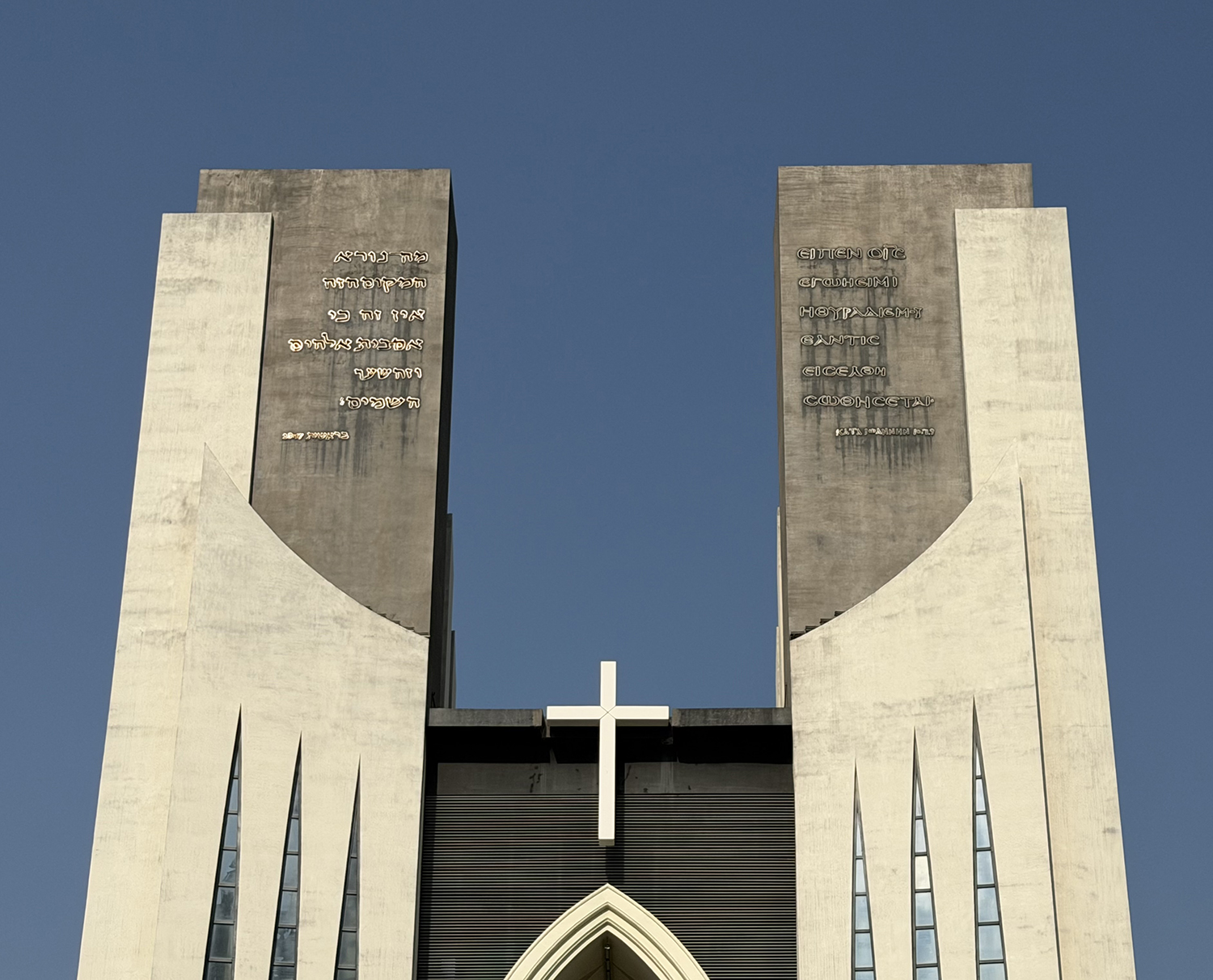 兩塔的頂端都綴上原文經句。一邊是希伯來文創世記二十八章十七節。「這真是神的殿,這是天的門!」(新漢語譯本,下同)。另一邊是希臘文約翰福音十章七、九節。「我是羊的門,我就是門。」兩塔之間的十架背下、分開遶着教堂的入口拱門,有吊下至台階地面的間條;象徵「雅各天梯」。天梯疊加十架,再次表徵由舊約時代到新約時代,上主一貫讓人親近祂。