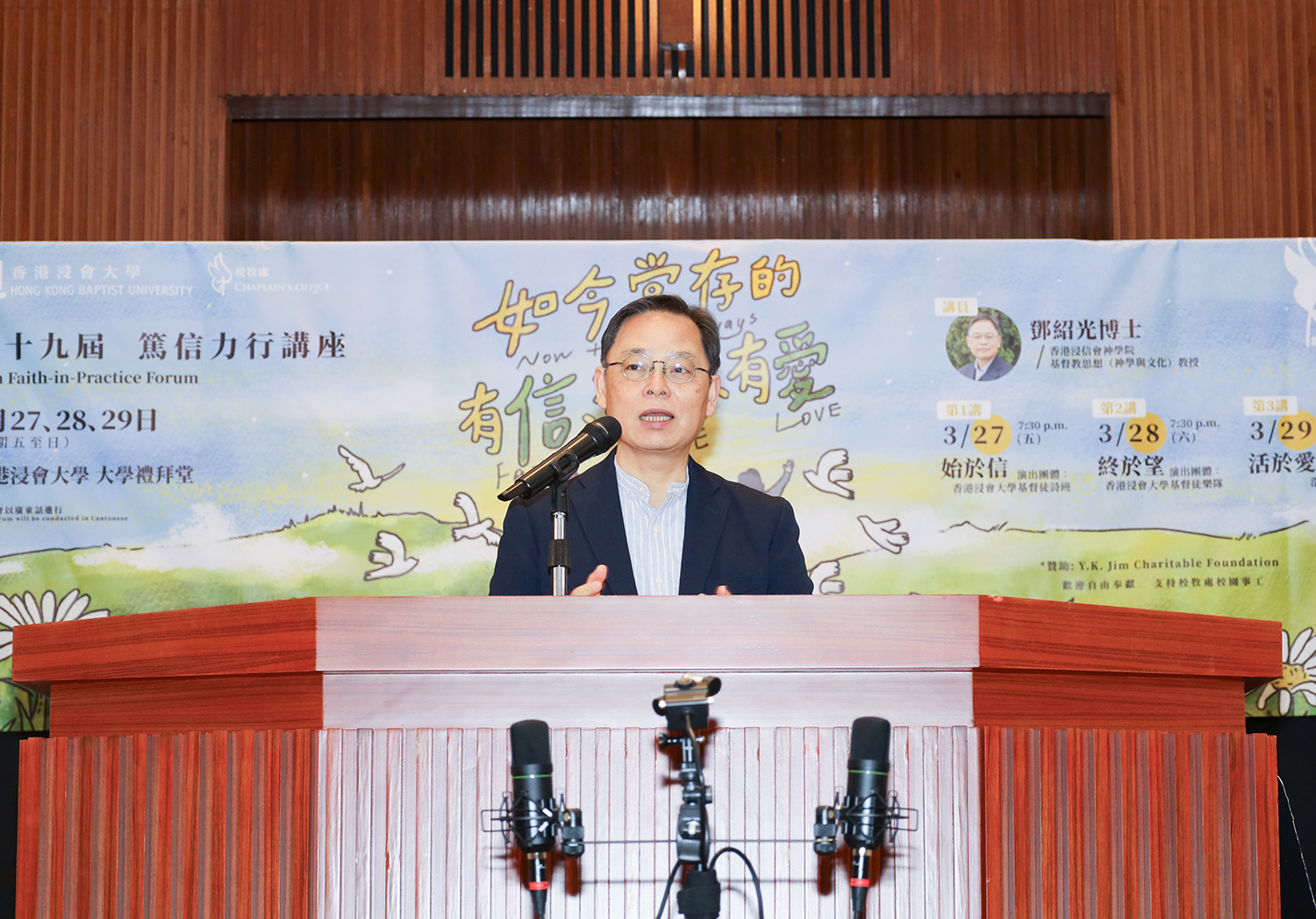香港浸會大學校牧處已於3月27至29日,一連3晚於該校大學禮拜堂舉辦「第十九屆篤信力行講座──如今常存的有信、有望、有愛」,由香港浸信會神學院基督教思想(神學與文化)教授鄧紹光博士擔任講員。第一、二晚信息主題分別為「始於信」、「終於望」,論及信徒與上帝的關係始於相信耶穌基督是主,由此進入盼望之中,等候祂再來的應許。