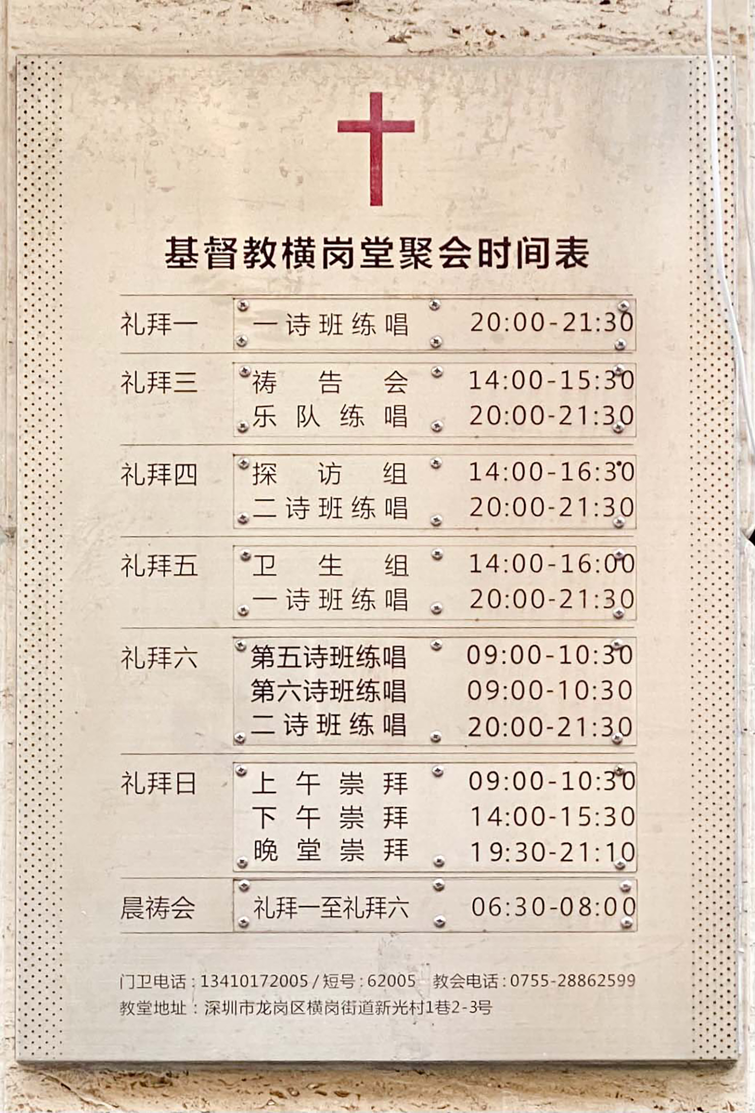 天國福音於1862年傳至橫崗。現時橫崗發展成為深圳的「眼鏡業專區」,眼鏡店數以百計。橫崗堂高舉十架,發出 「轉眼仰望主基督」 的呼喚。