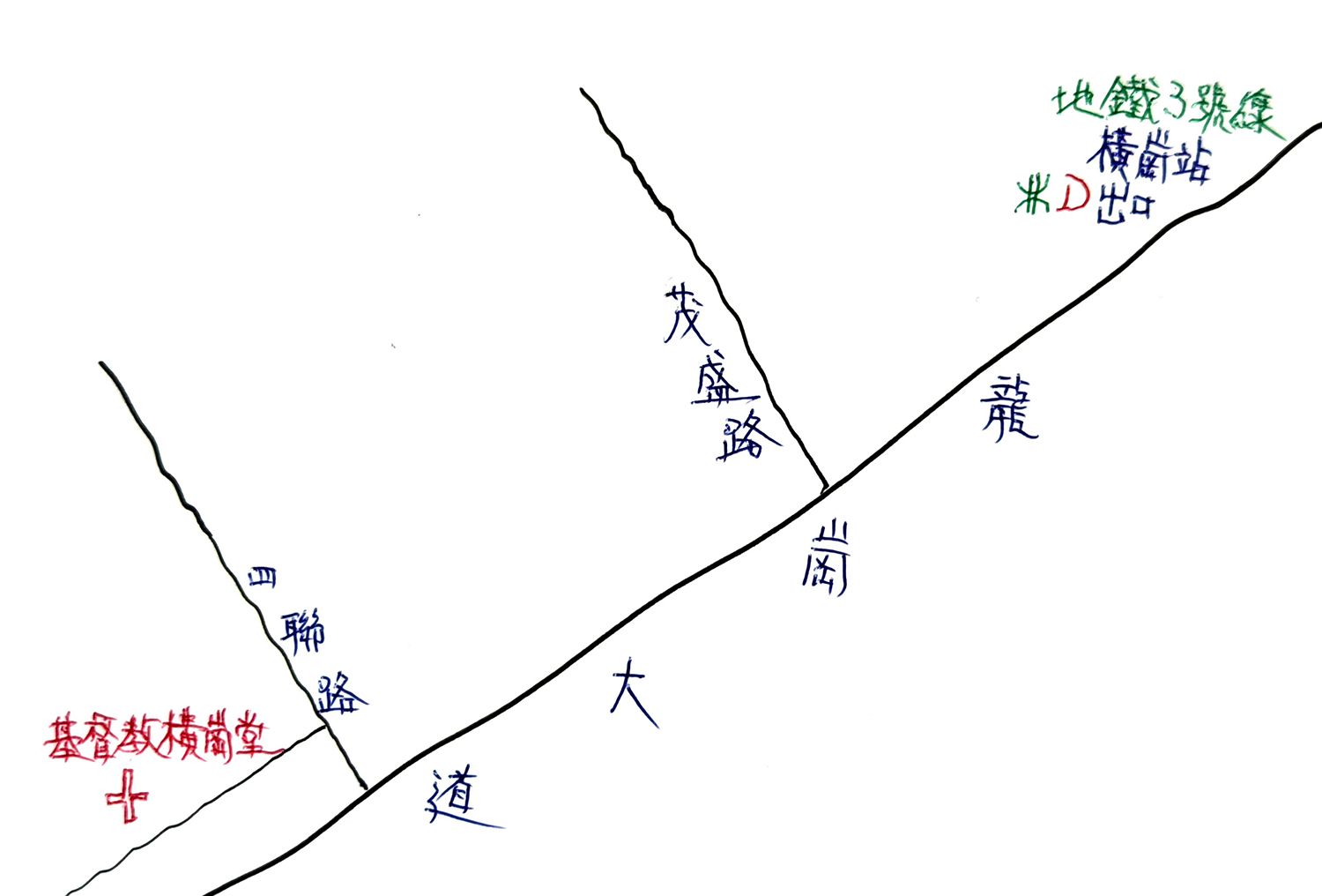 由橫崗站D出口走上地面,旁邊是龍崗大道。沿着大道直走大約五分鐘,依附圖所示轉入四聯路,路上的第一條後街,就見「基督教橫崗堂」。