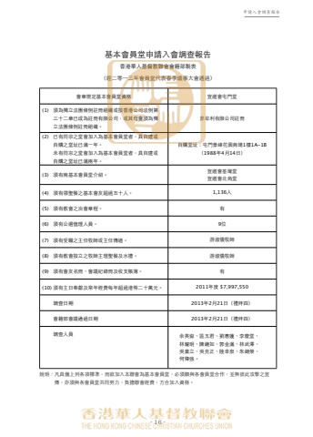 - 16 -申請入會調查報告基本會員堂申請入會調查報告香港華人基督教聯會會籍部製表(經二零⼀一三年會員堂代表春季議事大會通過)說明︰凡具備上列各項標準,而欲加入本聯會為基本會員堂,必須願與各會員堂合作,並無彼此攻擊之宣傳,亦須與各會員堂共同努力,負擔聯會經費,方合加入資格。會章規定基本會員堂資格 宣道會屯門堂 (1) 須為獨立法團條例註冊組織或按香港公司法例第三十二章已成為註冊有限公司,或其母會須為獨立法團條例註冊組織。非牟利有限公司註冊 (2) 已有同宗之堂會加入為基本會員堂者,具自建或自購之堂址已滿⼀一年。未有同宗之堂會加入為基本會員堂者,具自建或自購之堂址已滿兩年。自購堂址:屯門景峰花園商場1樓1A-1B(1988年4月14日) (3) 須有兩基本會員堂介紹。 宣道會荃灣堂宣道會北角堂 (4) 須有領聖餐之基本會友超過五十人。 1,136人 (5) 須有教會之治會章程。 有 (6) 須有公選值理人員。 9位 (7) 須有受職之主任牧師或主任傳道。 游淑儀牧師 (8) 須有教會按立之牧師主理聖餐及水禮。 游淑儀牧師 (9) 須有會友名冊、會議紀錄冊及收支賬簿。 有 (10) 須有主日奉獻及常年經費每年超過港幣二十萬元。 2011年度 $7,997,550調查日期 2013年2月21日(禮拜四)會籍部會議通過日期 2013年2月21日(禮拜四)調查人員 余英嶽、區玉君、劉惠蓮、李慶堂、林耀明、陳鏡如、郭金滿、林武澤、吳業立、吳克正、陸幸泉、朱錦榮、何偉強。
