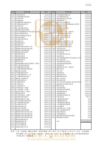 次序 堂會名稱 金額 次序 堂會名稱 金額- 20 - 249 牛頭角浸信會 7,000.00 250 中華基督教會深愛堂 6,511.00 251 深荃浸信會 6,500.00 252 西環靈糧堂 6,241.06 253 九龍閩南中華基督教會 6,000.00 254 牛頭角潮語浸信會 6,000.00 255 北角浸信會 6,000.00 256 青山道潮語浸信會 6,000.00 257 基督教宣道會荃灣堂 6,000.00 258 香港九龍塘基督教中華宣道會大坑東堂 6,000.00 259 香港天樂浸信教會 6,000.00 260 香港伯特利教會慈光堂 6,000.00 261 神召會保羅堂 6,000.00 262 香港懷恩浸信教會 6,000.00 263 恩潮浸信會 6,000.00 264 茶果嶺浸信會 6,000.00 265 荃灣浸信會 6,000.00 266 基督教香港信義會中心堂 6,000.00 267 基督教香港信義會尊聖堂 6,000.00 268 基督教會荃灣真道堂 6,000.00 269 港澳信義會聖恩堂 6,000.00 270 愛群道浸信會 6,000.00 271 置富浸信教會 6,000.00 272 筲箕灣潮語浸信會 6,000.00 273 銅鑼灣浸信會 6,000.00 274 興華浸信會 6,000.00 275 循道衛理聯合教會筲箕灣堂(附屬) 5,934.77 276 華人基督教會福音堂 5,652.00 277 中國基督教會義明堂 5,500.00 278 中國基督教播道會顯恩堂 5,500.00 279 基督教會迦密堂 5,500.00 280 中國基督徒恆恩會 5,385.00 281 中華基督教閩南三一堂 5,288.00 282 中華基督教會聖光堂 5,279.02 283 基督教上海禮拜堂 5,050.00 284 沙田潮語浸信會 5,004.00 285 九龍塘浸信會 5,000.00 286 上環浸信會 5,000.00 287 土瓜灣浸信會 5,000.00 288 大學浸信會(附屬) 5,000.00 289 沙田靈糧堂(附屬) 5,000.00 290 海怡浸信教會(附屬) 5,000.00 291 圓洲角浸信會 5,000.00 292 屯門浸信教會(附屬) 4,950.00 293 香港路德會恩典堂 4,900.00 294 基督教協基會主恩堂 4,841.00 295 中華完備救恩會塔門堂 4,800.00 296 中華基督教會基真堂 4,800.00 297 宣道會深水埗堂 4,800.00 298 香港華僑長老會 4,800.00 299 神召會石硤尾堂 4,800.00 300 基督教宣道會華基堂 4,800.00 301 基督教香港信義會永生堂 4,800.00 302 基督教香港信義會榮光堂 4,800.00 303 基督教香港信義會鑽石堂 4,800.00 304 基督教香港崇真會荃葵堂 4,800.00 305 勝利道潮語浸信會 4,800.00 306 博愛潮語浸信會 4,800.00 307 灣仔潮語浸信會 4,800.00 308 加略山基督教會 4,550.00 309 港澳信義會活石堂 4,550.00 310 中華基督教會雅各堂 4,500.00 311 尖沙咀國語浸信會 4,500.00 312 香港路德會救主堂區會 4,500.00 313 恩典浸信會 4,500.00 314 路德會長沙灣頌恩堂 4,500.00 315 港九五旬節會香港衛城道五旬節堂 4,313.48 316 旺角潮語浸信會 4,200.00 317 神召會元朗錦光堂 4,200.00 318 基督教基恩會 4,200.00 319 基督教會活石堂(香港堂) 4,200.00 320 九華徑基督教會信得堂 4,080.00 321 香港聖公會聖路加堂 4,080.00 322 金巴崙長老會沙田堂 4,018.00 323 大埔浸信會 4,000.00 324 中國基督徒傳道會中心堂 4,000.00 325 中國基督徒傳道會西大堂 4,000.00 326 中華完備救恩會赤柱堂 4,000.00 327 元朗潮語浸信會真理堂 4,000.00 328 牛頭角靈光堂 4,000.00 329 基督教協基會嶺英堂 4,000.00 330 旺角浸信會 4,000.00 331 東方基督教會恩光堂 4,000.00 332 紅磡浸信會 4,000.00 333 香港九龍塘基督教中華宣道會上水堂 4,000.00 334 神召會聖光堂 4,000.00 335 香港基督教會宣道堂 4,000.00 336 香港基督教閩南真理堂 4,000.00 337 柴灣浸信會 4,000.00 338 基督教會活石堂(九龍堂) 4,000.00 339 基磐浸信會 4,000.00 340 新生命堂 4,000.00 341 葵涌浸信會 4,000.00 342 鴨脷洲浸信會 4,000.00 343 觀塘國語浸信會 4,000.00 344 鑽石山浸信會 4,000.00 345 路德會協同堂 4,000.00 346 港九五旬節會九龍窩打老道五旬節堂 3,971.48 347 基督教香港崇真會旺角堂 3,960.00 348 錫安浸信會 3,850.00 349 宣道會西環堂 3,794.24 350 香港路德會聖約翰堂 3,150.00 351 荃灣潮語浸信會 2,990.00 352 西環基督教會 2,627.90 353 香港路德會聖腓力堂 1,800.00 354 同寅浸信會 899.44 355 九龍城潮語浸信會 0.00 356 九龍國語浸信會 0.00 357 中華基督教會基灣堂 0.00 358 中華基督教會望覺堂 0.00 359 旺角靈糧堂 0.00 360 宣道會富山堂(附屬) 0.00 361 香港上環潮語浸信會 0.00 362 路德會真道堂 0.00 363 荃灣靈糧新堂 0.00 364 基督教香港崇真會筲箕灣堂 0.00 365 廣源邨禧年浸信會 0.00 合計 10,494,484.99附註:上表「收益捐」欄內之款項,收款日期自二零一四年一月一日起至十二月三十一日止,凡在該期間內補繳二零一三年度者,已經列入,惟在二零一五年一月一日後補繳二零一四年度者則該款並不列在表內,敬請留意。 財政報告