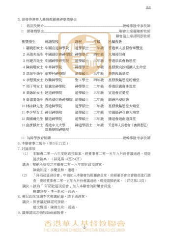 -2-5. 頒發香港華人基督教聯會神學獎學金I 致詞及簡介.........................................................................................................................總幹事陸幸泉牧師II 頒發獎學金...................................................................................................................聯會主席龐建新牧師聯會副主席胡明添牧師獲獎學生 就讀院校 課程 年級 所屬教會 1 羅曉彤女士 中國宣道神學院 道學碩士 三年級 香港華人基督會華豐堂 2 巫啟充先生 中國浸信會神學院 神學學士 四年級 大埔浸信會 3 何建邦先生 中國神學研究院 道學碩士 三年級 香港崇真會救恩堂 4 陳綺珊女士 中華神學院 神學學士 三年級 基督教尖沙咀潮人生命堂 5 馮景明先生 伯特利神學院 道學碩士 三年級 基督教滙基堂 6 李慧雯女士 牧職神學院 聖工學士 四年級 基督教銘恩堂粉嶺堂 7 周于琴女士 信義宗神學院 神學學士 二年級 香港信義會沐恩堂 8 黃詠貽女士 建道神學院 道學碩士 三年級 宣道會宣愛堂 9 彭偉業先生 香港浸信會神學院 道學碩士 二年級 圓洲角浸信會10 林泳鋒先生 香港神學院 道學碩士 三年級 基督教銘恩堂大埔堂11 李少琴女士 神召神學院 道學碩士 二年級 竹園區神召會大埔堂12 黃國瀚先生 播道神學院 道學碩士 三年級 播道會迦南道真堂13 曲彥靜女士 香港中文大學 神道學碩士 二年級 天恩華人長老會(澳洲悉尼)崇基學院神學院III 為神學教育祈禱..............................................................................................................總幹事陸幸泉牧師6. 本聯會事工報告(第3至12頁)7. 討論事項(1) 本聯會二零一六年度財政預算案,經董事會二零一五年九月份會議通過,現提請接納案。(詳見第14至24頁)議決:接納所提交之本聯會二零一六年度財政預算案。 陳鏡如提,李慶堂和,通過。(2) 「阡陌社區浸信會」申請加入本聯會為附屬會員堂,前經董事會交會籍部進行調查,復經董事會二零一五年九月份會議通過,現提請接納案。(詳見第13頁)議決: 接納「 阡陌社區浸信會」加入本聯會為附屬會員堂。楊耀宗提,李一新和,通過。8. 書記即席宣讀本次會議紀錄,請予通過案。議決: 照會議紀錄認可接納。 趙文賢提,陳偉生和,通過。9. 議畢請梁志強牧師祝福散會。議錄