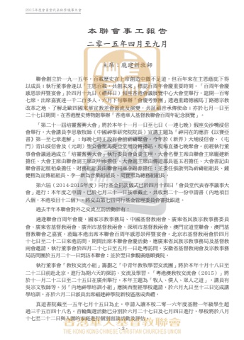 - 3 -2015年度會員堂代表秋季議事大會本聯會事工報告二零一五年四月至九月主席:龐建新牧師聯會創立於一九一五年,百載歷史在上帝創造中微不足道,但百年來在主恩蔭庇下得以成長;執行董事會遂以「主恩百載,共創未來」標誌百周年會慶重要時刻。「百周年會慶感恩崇拜暨宴會」於四月十九日(禮拜日)假座香港會議展覽中心大會堂舉行,筵開一百零七席,出席嘉賓達一千二百多人。六月下旬舉辦「會慶考察團」透過重踏德國馬丁路德宗教改革之地、了解北歐四國來華宣教差會源流及演變,共証福音承傳使命;亦於七月一日至二十七日期間,在香港歷史博物館舉辦「香港華人基督教聯會百周年紀念展覽」。「第二十一屆培靈奮興大會」將於本年十一月一日至七日(一連七晚)假座尖沙嘴浸信會舉行,大會講員李思敬牧師(中國神學研究院院長)宣講主題為「神同在的應許《以賽亞書》第一至七章進解」;每晚七時正設有會前祈禱聚會。今年於(新界)大埔浸信會、(屯門)青山浸信會及(元朗)聖公會聖馬提亞堂增設轉播站,現場直播七晚聚會。前經執行董事會會議通過成立「培靈奮興大會」執行委員會負責主理,大會名譽主席由聯會主席龐建新擔任、大會主席由聯會副主席胡明添擔任、大會副主席由傳道部長區玉君擔任、大會書記由聯會書記植栢燊擔任、財務組組長由聯會司庫李賜源擔任;並委任張啟明為祈禱組組長、鍾健楷為宣傳組組長、李一新為音樂組組長、周寶熙為總務組組長。第六屆(2014-2015年度)同行基金捐款儀式已於四月十四日「會員堂代表春季議事大會」進行;本年度之申請,已於七月三十一日按章截止,共收到二十一份申請書(內地項目八個,本港項目十三個),將交由第七屆同行基金管理委員會審批跟進。過去半年本聯會對外之交流互訪活動計有:適逢聯會百周年會慶,國家宗教事務局、中國基督教兩會、廣東省民族宗教事務委員會、廣東省基督教兩會、廣州市基督教兩會、深圳市基督教兩會、澳門宣道堂聯會、澳門基督教聯會之嘉賓,蒞臨本港出席本聯會百周年感恩崇拜暨宴會。北京市基督教兩會於四月十七日至二十二日來港訪問,期間出席本聯會會慶活動。應廣東省民族宗教事務局及基督教兩會邀請,執行董事會於四月二十七日至五月一日赴粵訪問。安徽省基督教兩會及宗教事務局訪問團於五月二十一日到訪本聯會;並於翌日參觀廣蔭頤養院。執行董事會「教牧交流小組」籌劃之「中青年教牧學習交流團」將於本年十月十八日至二十三日前赴北京,進行為期六天的探訪、交流及學習。「粵港澳教牧交流會(2015)」將於十一月二十三日至二十五日在廣州舉行,本年主題為「牧人、僕人、眾人之道」,講員有吳宗文牧師等。另「內地神學培訓小組」應陝西聖經學校邀請,於六月九日至十三日完成講學培訓,亦於六月二日派員出席福建神學院新校區落成典禮。真道書院截至一五年七月十五日為止,申請入讀本校二零一六年度基階一年級學生超過三千五百四十八名。首輪甄選活動已分別於六月二十七日及七月四日進行,學校將於八月十七至二十二日與入圍的家庭進行個別面談活動及評估。