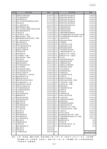 - 24 - 次序 堂會名稱 金額 次序 堂會名稱 金額- E -253 基督教會荃灣真道堂 8,340.00254 中華基督教福音堂 8,192.41255 荃灣潮語浸信會 8,190.00256 港九五旬節會香港衞城道五旬節堂 8,112.68257 旺角浸信會 8,000.00258 青山道潮語浸信會 8,000.00259 基督教樂道會元朗堂 8,000.00260 港九五旬節會九龍窩打老道五旬節堂 7,850.32261 將軍澳基督教錫安堂 7,679.60262 元朗浸信會 7,500.00263 大學浸信會(附屬) 7,500.00264 播道會彩福堂(附屬) 7,500.00265 循道衞理聯合教會筲箕灣堂(附屬) 7,293.23266 華人基督教會福音堂 7,236.00267 灣仔潮語浸信會 7,200.00268 港澳信義會聖恩堂 7,200.00269 中華完備救恩會塔門堂 7,200.00270 牛頭角潮語浸信會 7,200.00271 基督教上海禮拜堂 7,100.00272 牛頭角浸信會 7,000.00273 茶果嶺浸信會 7,000.00274 沙田靈糧堂(附屬) 7,000.00275 海怡浸信教會(附屬) 7,000.00276 同寅浸信會 6,803.71277 香港路德會恩典堂 6,800.00278 基督教會迦密堂 6,800.00279 中華基督教會深愛堂 6,735.00280 神召會保羅堂 6,600.00281 香港路德會聖約翰堂 6,500.00282 九華徑基督教會信得堂 6,500.00283 香港聖公會聖匠堂 6,488.87284 中華基督教會合一堂北角堂 6,448.96285 港澳信義會活石堂 6,350.00286 廣源邨禧年浸信會 6,300.00287 基督教香港崇真會荃葵堂 6,200.00288 中華基督教閩南三一堂 6,157.00289 香港路德會救主堂區會 6,050.00290 香港聖公會聖路加堂 6,000.00291 中華基督教會雅各堂 6,000.00292 中華基督教會基真堂 6,000.00293 北角浸信會 6,000.00294 香港天樂浸信教會 6,000.00295 銅鑼灣浸信會 6,000.00296 香港懷恩浸信教會 6,000.00297 香港西區浸信教會 6,000.00298 愛群道浸信會 6,000.00299 鴨脷洲浸信會 6,000.00300 筲箕灣潮語浸信會 6,000.00301 置富浸信教會 6,000.00302 土瓜灣浸信會 6,000.00303 恩典浸信會 6,000.00304 恩潮浸信會 6,000.00305 博愛潮語浸信會 6,000.00306 旺角潮語浸信會 6,000.00307 尖沙咀國語浸信會 6,000.00308 基磐浸信會 6,000.00309 九龍國語浸信會 6,000.00310 紅磡浸信會 6,000.00311 勝利道潮語浸信會 6,000.00312 錫安浸信會 6,000.00313 荃灣浸信會 6,000.00314 沙田潮語浸信會 6,000.00315 基督教香港信義會真愛堂 6,000.00316 基督教香港信義會鑽石堂 6,000.00317 基督教香港信義會永生堂 6,000.00318 基督教香港信義會榮光堂 6,000.00319 基督教香港信義會尊聖堂 6,000.00320 基督教香港崇真會旺角堂 6,000.00321 香港路德會錫安堂 6,000.00322 香港路德會頌恩堂 6,000.00323 香港路德會真道堂 6,000.00324 中國基督教播道會顯恩堂 6,000.00325 香港九龍塘基督教中華宣道會大坑東堂 6,000.00326 香港九龍塘基督教中華宣道會上水堂 6,000.00327 宣道會深水埗堂 6,000.00328 基督教宣道會荃灣堂 6,000.00329 旺角靈糧堂 6,000.00330 金巴崙長老會沙田堂 6,000.00331 基督教協基會主恩堂 6,000.00332 基督教協基會嶺英堂 6,000.00333 中華完備救恩會赤柱堂 6,000.00334 中國基督徒傳道會中心堂 6,000.00335 基督教會活石堂(香港堂) 6,000.00336 基督教會活石堂(九龍堂) 6,000.00337 新生命堂 6,000.00338 香港伯特利教會慈光堂 6,000.00339 中國基督教會義明堂 6,000.00340 中國基督徒恆恩會 6,000.00341 九龍閩南中華基督教會 6,000.00342 香港基督教會宣道堂 6,000.00343 加略山基督教會 6,000.00344 南亞路德會靈恩堂 6,000.00345 牛頭角靈光堂 6,000.00346 東方基督教會恩光堂 6,000.00347 深荃浸信會 6,000.00348 路德會長沙灣頌恩堂 6,000.00349 基督教宣道會厚德堂(附屬) 6,000.00350 屯門浸信教會(附屬) 6,000.00351 宣道會富山堂(附屬) 6,000.00352 路德會協同堂 5,999.99353 中華基督教會聖光堂 5,816.29354 柴灣浸信會 5,800.00355 西貢浸信會 5,500.00356 香港華僑長老會 5,500.00357 香港聖公會聖約瑟堂 5,192.00358 神召會聖光堂 5,000.00359 元朗潮語浸信會真理堂 5,000.00360 基督教基恩會 4,500.00361 香港基督教閩南真理堂 4,340.00362 香港路德會聖腓力堂 4,050.00363 香港路德會愛心堂(附屬) 3,733.66364 金巴崙長老會牧民堂(附屬) 3,123.00365 大埔浸信會 3,000.00366 神召會石硤尾堂 3,000.00367 基督教協基會聖馬可堂(附屬) 2,353.50368 中華基督教禮賢會慈雲山堂(附屬) 1,855.73369 西環基督教會 1,677.00370 觀塘國語浸信會 0.00371 彩坪浸信會 0.00372 基督教香港信義會合一堂 0.00373 楊屋新村基督教會 0.00合計 $11,926,867.80附註:上表「收益捐」欄內之款項,收款日期自二零一六年一月一日起至十二月三十一日止,凡在該期間內補繳二零一五年度者,已經列入,惟在二零一七年一月一日後補繳二零一六年度者則該款並不列在表內,敬請留意。財政報告
