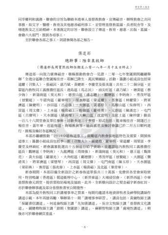 - 6 -聯會事工報告- 4 -聯會事工報告同享權利和義務。聯會的宗旨為聯絡本港華人基督教教會,宣傳福音,辦理教會之共同事務,如文字、醫療、教育及其他慈善福利事工,並管理基督教墓園、長者院舍等,及增進教友之互助精神。本著既定的宗旨,聯會設立了傳道、教育、慈惠、出版、墓園、會籍六大部門,推展各項事工。至於聯會各部之事工,則請參閱各部之報告。傳道部總幹事:陸幸泉牧師(傳道部長周寶熙牧師任期至二零一八年一月十五日終止)傳道部一向致力廣傳福音,積極推動教會合一見證,二零一七年聖誕期間繼續舉辦「全港分區聯合聖誕報佳音-耶穌已降生、萬民樂繽紛」活動,籌劃小組成員包括梁遠耀(召集人)、張福民、湛乃斌、黃健新、李慶堂及張美蓮;共有二十二個分區,並蒙區內教牧同工義務擔任區長:港島區(馬志民)、油尖旺區(湛乃斌)、塘黃區(蔡少海)、新蒲崗區(莫元和)、慈雲山區(潘志聰)、觀塘區(李炳南)、秀茂坪區(曾繁庭)、牛頭角區(羅華明)、深水埗區(梁遠耀)、荃葵區(林耀榮)、將軍澳區(陳健明)、沙田區(呂必強)、大圍區(黃惠珍)、馬鞍山區(吳偉明)、西貢區(周文傑)、上水區(楊貴福)、粉嶺區(羅桂英)、元朗區(陳漢忠)、屯門區(呂寶明)、天水圍區(姚國樑)、大嶼山區(沈富明)及紅土區(陳仲康)動員一百八十八間堂會及單位參與,活動多達三十多項,形式包括:電車報佳音、開蓬巴士報佳音、嘉年華、巡區佈道、商場匯演等。區長感恩及檢討會議已於二月五日順利進行,匯報及檢討各區概況。本部亦繼續推動「2018分區佈道事工」鼓勵區內教會按地區特色及需要,開展佈道事工;籌劃小組成員包括李一新(召集人)、鍾健楷、羅華明、梁遠耀、周榮富、李慶堂及林綺紅。經會議審批選出十五個區份給予資助,並邀請區內教牧同工義務擔任區長:觀塘區(李炳南)、九龍灣區(周偉強)、新蒲崗區(莫元和)、慈王區(甄偉亮)、黃大仙區(羅雄光)、大角咀區(鄺德勝)、秀茂坪區(曾繁庭)、大圍區(龔清英)、將軍澳區(梁慧琴)、西貢區(周文傑)、屯門南區(陳玉珍)、天水圍區(梁彩燕)、葵青區(張兆蓉)、上水區(楊貴福)及北區(葉青華)。新春期間,本部印備全新設計之新春佈道單張共三十萬張,免費供各堂會索取使用。特別鳴謝(香港區)循道衛理中心、(新界東區)大埔浸信會、(新界西區)中華基督教會元朗堂,提供領取站場地及協助。此外,全新橫向設計之熨金福字新春紅封,亦於聯會辦事處及部分基督教書室公開發售。本部為提升教牧同工於講壇事奉之質素,每期均邀請本地資深牧者及神學院講師作講道示範。本年再接再勵,舉辦第十一期「講壇事奉研習」,講員包括:黃鐘牧師主講「保羅書信講道」、何述儉牧師主講「先知書講道」、吳宗文牧師主講「基督教文化講道」、鍾健楷牧師主講「節期(聖誕節)講道」、蘇穎智牧師主講「處境性講道」;稍後亦可於聯會網頁重溫。