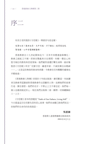 / xii / 香港教會人物傳第二冊序二有首古老的聖詩《守信歌》,劈頭首句是這樣:先賢之信!萬世永存,火中不滅,刀下猶生;我眾思念先賢聖蹟,心中亦覺踴躍奮興。香港教會自十九世紀開埠迄今,百多年來歷盡滄桑變化,教會之能屹立不倒,即使在戰亂和日佔期間,有賴一羣忠心和堅守崗位的教牧和信徒領袖,他們縱然曾遭打擊及凌辱,就好像聖詩《守信歌》所言「先賢守信,雖進牢獄,不減快樂自由精神⋯⋯」。正是這份無我的捨身和承擔,令教會在任何艱難的處境也平順度過。《香港教會人物傳》首冊於十年前出版後,廣受歡迎,有助讀者及教會界認識曾對香港教會作出貢獻的人物。追溯他們的故事行述,實在感恩;他們的名字,不單止上主不會忘記,我們每一個人也應該銘記於心。現在我們出版第二冊,願將一切榮耀歸給三一上主。《守信歌》原本的詩題是“Faith of Our Fathers, Living Still”。今日重溫這百位先賢先信的信心故事,他們肉身雖已捨我們而去,但他們的生命仍向你我說話。吳思源香港華人基督教聯會出版部部長2024年6月1日