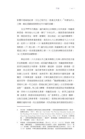 序論 / xv /影響中港兩地社會、文化之現代化,意義尤其重大。8本書為四人立傳,藉此透露基督教對近代中國的貢獻。及至1949年內戰後,國內歐美五宗傳教士及其資源,相繼南移香港。與本地七大公會,實行「中西合作」,發展香港的教會事業,開設新堂址、辦學、建醫院、設出版社、成立福利機構等。促成戰後香港教會蓬勃發展,進而由七大公會演變成今之六大宗派,此即(1)浸信會;(2)倫敦傳道會與美部會合一而成中華基督教會;(3)聖公會;(4)國內美以美會(美國衞理公會)南下與循道公會合一而成循道衞理公會;(5)巴色會演變而成崇真會;(6)巴冕會則成禮賢會。與此同時,六大宗派以外之歐美傳教士及華人教牧信徒亦基於宣教動機;或自行來港;或因國內戰亂而來,相繼創辦新教會。前者先後創設五旬節會、聖潔會、播道會、宣道會、路德會、信義會、美北浸信會、協同會等新宗派教會。後者則開設方言教會如潮人生命堂、閩南堂、海南堂等;獨立教會如中國佈道會、靈糧堂、中華傳道會、協基會、中華完備救恩會及本土教會如平安福音堂等,香港基督教由是進入新階段。9隨着戰後難民之增多;香港本土新一代之成長;香港社會之資本主義化;以至香港回歸,面對「一國兩制」等之重大轉變。香港教會均需面對此等挑戰與適應,其時六大宗派與新生教會,相繼投身港、九、新界之福音普傳,故教堂、教會如雨後春筍萌生,而「普濟眾生」之教育、醫療、出版及慈惠之教會事業,亦紛紛建立。服務社會各種功能的福音機構亦遍佈本港,均以基督精神,同為香港社會的發展肩負責任,8 李志剛:〈馬禮遜紀念學校的創立經過及影響〉,《香港基督教會史研究》(香港:道聲出版社,1987),頁51-66;Carl Smith, “The Morrison Education Society and the Moulding of Its Students,” Chinese Christians: Elites, Middlemen, and the Church in Hong Kong (Hong Kong: Oxford University Press, 1985), 13-33;李金強:〈西學搖籃 —清季香港雙語精英的誕生〉,黃愛平、黃興濤編:《西學與清代文化》(北京:中華書局,2008),頁694-699。9 邢福增:《香港基督教史研究導論》,頁44-51、87-101、110-122;李金強、劉義章編:《聲教廣披 —基督教與華南方言族群》(香港:建道神學院,2016),頁v-vi;彭淑敏:《香港漁民教會》(香港:基督教中國宗教文化研究社,2023),頁12-107。聖潔會、中華完備救恩會等關注漁民福音,促成香港漁民教會的發展。