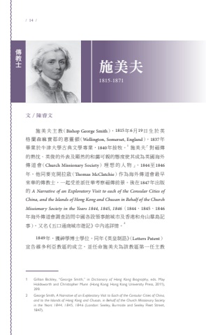 / 14 / 傳教士 施美夫1815-1871文 / 陳睿文施 美 夫 主 教(Bishop George Smith),1815年6月19日生於英格蘭森麻實郡的惠靈頓(Wellington, Somerset, England)。1837年畢業於牛津大學古典文學專業,1840年按牧。1施美夫「對福傳的熱忱、英俊的外表及顯然的和藹可親的態度使其成為英國海外傳 道 會(Church Missionary Society)理 想 的 人 物 」。1844至1846年,他同麥克開拉啟(Tomas McClatchie)作為海外傳道會最早來華的傳教士,一起受差派往華考察福傳前景。後在1847年出版的 A Narrative of an Exploratory Visit to each of the Consular Cities of China, and the Islands of Hong Kong and Chusan in Behalf of the Church Missionary Society in the Years 1844, 1845, 1846(1844、1845、1846年海外傳道會調查訪問中國各設領事館城市及香港和舟山羣島記事),又名《五口通商城市遊記》中內述詳情。21849年,獲神學博士學位。同年《英皇制誥》(Letters Patent)宣告維多利亞教區的成立,並任命施美夫為該教區第一任主教1 Gillian Bickley, “George Smith,” in Dictionary of Hong Kong Biography, eds. May Holdsworth and Christopher Munn (Hong Kong: Hong Kong University Press, 2011), 399.2 George Smith, A Narrative of an Exploratory Visit to Each of the Consular Cities of China, and to the Islands of Hong Kong and Chusan, in Behalf of the Church Missionary Society in the Years 1844, 1845, 1846 (London: Seeley, Burnside and Seeley Fleet Street, 1847).