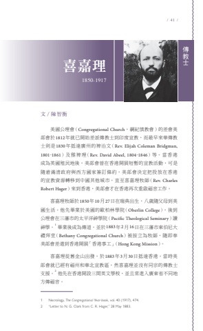 / 41 /傳教喜嘉理 士1850-1917文 / 陳智衡美國公理會(Congregational Church,綱紀慎教會)的差會美部會於1812年就已開始差派傳教士到印度宣教,而最早來華傳教士則是1830年抵達廣州的裨治文(Rev. Elijah Coleman Bridgman, 1801-1861)及雅裨理(Rev. David Abeel, 1804-1846)等。當香港成為英國殖民地後,美部會曾在香港開展短暫的宣教活動,可是隨着滿清政府與西方國家簽訂條約,美部會決定把投放在香港的宣教資源轉移到中國其他城市。直至喜嘉理牧師(Rev. Charles Robert Hager)來到香港,美部會才在香港再次重啟福音工作。喜嘉理牧師於1850年10月27日在瑞典出生,八歲隨父母到美國生活。他先畢業於美國的歐柏林學院(Oberlin College),後到公理會在三藩市的太平洋神學院(Pacific Theological Seminary)讀神學。1畢業後成為傳道,並於1883年2月16日在三藩市東伯尼大禮拜堂(Bethany Congregational Church)被按立為牧師,隨即奉美部會差遣到香港開展「香港事工」(Hong Kong Mission)。喜嘉理從舊金山出發,於1883年3月30日抵達香港。當時美部會就已經有福州和華北宣教區,然喜嘉理並沒有同宗的傳教士支援。2他先在香港開設三間英文學校,並且常進入廣東省不同地方傳福音。1 Necrology, The Congregational Year-book, vol. 40 (1917), 474.2 “Letter to N. G. Clark from C. R. Hager,” 28 May 1883.