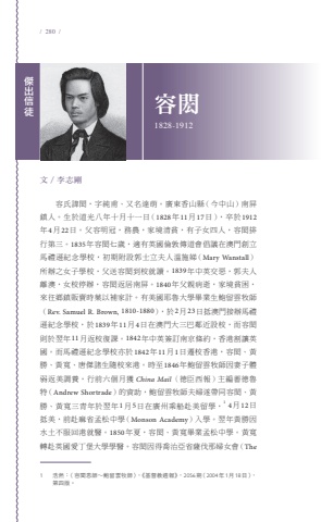 / 280 / 傑出信徒 容閎1828-1912文 / 李志剛容氏諱閎,字純甫、又名達萌。廣東香山縣(今中山)南屏鎮人。生於道光八年十月十一日(1828年11月17日),卒於1912年4月22日。父容明冠,務農,家境清貧,有子女四人,容閎排行第三。1835年容閎七歲,適有英國倫敦傳道會倡議在澳門創立馬禮遜紀念學校,初期附設郭士立夫人溫施娣(Mary Wanstall)所辦之女子學校,父送容閎到校就讀。1839年中英交惡,郭夫人離澳,女校停辦,容閎返居南屏。1840年父親病逝,家境貧困,來往鄉鎮販賣時菓以補家計。有美國耶魯大學畢業生鮑留雲牧師(Rev. Samuel R. Brown, 1810-1880),於2月23日抵澳門接辦馬禮遜紀念學校,於1839年11月4日在澳門大三巴鄰近設校,而容閎則於翌年11月返校復課。1842年中英簽訂南京條約,香港割讓英國。而馬禮遜紀念學校亦於1842年11月1日遷校香港,容閎、黃勝、黃寬、唐傑諸生隨校來港。時至1846年鮑留雲牧師因妻子體弱返美調養,行前六個月獲 China Mail(德臣西報)主編蓄德魯特(Andrew Shortrade)的資助,鮑留雲牧師夫婦遂帶同容閎、黃勝、黃寬三青年於翌年1月5日在廣州乘船赴美留學,14月12日抵美,前赴麻省孟松中學(Monson Academy)入學。翌年黃勝因水土不服回港就醫。1850年夏,容閎、黃寬畢業孟松中學。黃寬轉赴英國愛丁堡大學學醫。容閎因得喬治亞省薩伐那婦女會(The 1 浩然:〈容閎恩師∼鮑留雲牧師〉,《基督教週報》,2056期(2004年1月18日),第四版。