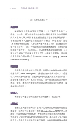 / 346 / 香港教會人物傳第二冊以下按姓名筆畫排序吳梓明英國倫敦大學教育學院哲學博士。曾任教於香港中文大學達二十三年。現為崇基學院宗教及中國社會研究中心榮譽研究員、上海大學文學院客座教授及香港宏恩基督教學院教授、香港聖公會西九龍教區諸聖座堂資深教友、牧區議員。著有《香港教會辦學初探》、《基督教大學與國學研究》、《基督教大學華人校長研究》、《五十年來崇基學院的基督教教育》、《基督宗教與中國大學教育》、《百年樹人:中國基督教教育意義重尋》、《全球地域化視角下的中國基督教大學》、《中國化基督教:以中國教會大學史作個案研究》及 Liberal Arts and the Legacy of Christian Universities in China 等。范晋豪香港聖公會諸聖座堂主任牧師,英國聖公會倫敦南華克教區教憲牧師(Canon Teologian),香港聖公會《教聲》督印人,香港中文大學崇基學院校董,崇基學院神學院校董,拔萃男書院校董,諸聖中學校董會主席,基榮小學校監。近年致力推廣聖公宗神學傳統、泰澤、本篤和方濟靈修傳統的研究及流行文化如動畫、漫畫與電影的反思。胡清心香港中文大學文化與宗教研究系哲學博士,現為記者。胡健斌德國波恩大學哲學博士;香港中文大學崇基學院神學院神道學碩士、宗教研究文學碩士。德國 Globalintelligenz 機構創辦人兼總監、中國基督教史學會執委、香港信義宗神學院本地訪問講師、香港中文大學崇基學院神學院名譽副研究員、澳洲神道大學名譽副研究員、香港宏恩基督教學院兼任講師、中華基督教禮賢會香港