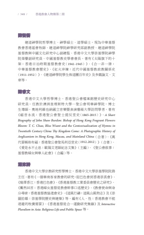 / 348 / 香港教會人物傳第二冊陳智衡建道神學院哲學博士、神學碩士、道學碩士。現為中華基督教會香港區會牧師、建道神學院神學研究部副教授、建道神學院基督教與中國文化研究中心副總監、香港中文大學崇基學院神學院榮譽副研究員、中國基督教史學會會長。著有《太陽旗下的十架:香港日治時期基督教會史(1941-1945)》、《合一非一律:中華基督教會歷史》、《紅火淬煉:近代中國基督教政教關係史(1911-1952)》、《建道神學院學生佈道團百年史》及多篇論文、文章等。陳睿文香港中文大學哲學博士。香港聖公會檔案館歷史研究中心研究員。任教於澳洲查理斯特大學—聖公會明華神學院,博士生導師。奧地利維也納國立音樂暨表演藝術大學訪問學者。著有《福音永流:香港聖公會聖士提反堂史(1865-2015)》、A Short Biography of John Shaw Burdon: Bishop of Hong Kong Fragrant Flowers Bloom: T. C. Chao, Bliss Wiant and the Contextualization of Hymns in Twentieth Century China Ty Kingdom Come: A Photographic History of Anglicanism in Hong Kong, Macau, and Mainland China(合著)、《萬代要稱妳有福:香港聖公會聖馬利亞堂史(1912-2012)》(合著)、《愛是永不止息:歐陽文老師紀念文集》(主編)、《聖公會敘事:基督教婦女與華人社會》(合編)等。湯泳詩香港中文大學宗教研究哲學博士。香港中文大學崇基學院院務主任。著有《一個華南客家教會的研究:從巴色會到香港崇真會》、《瑞澤香江:香港巴色會》、《香港基督教工業委員會歷史之研究》、《驀然回首:香港婦女基督徒教會幹事口述歷史》、《教會使命與身分尋索:香港基督教協進會史》、《道風行禱:道風山風物志》及《崇園拾韻:崇基學院歷史與建築》等,編有《人.性:香港教會不能迴避的牧養需要》、《香港基督徒合一運動研究集錄》及 Interactive Pluralism in Asia: Religious Life and Public Space 等。