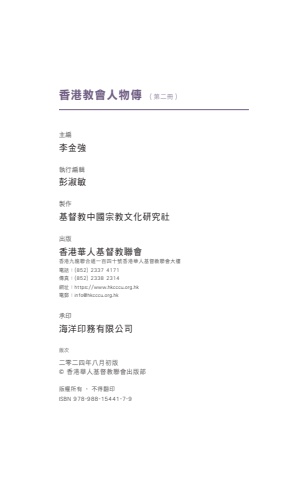 香港教會人物傳 (第二冊)主編李金強執行編輯彭淑敏製作基督教中國宗教文化研究社出版香港華人基督教聯會香港九龍聯合道一百四十號香港華人基督教聯會大樓電話:(852) 2337 4171傳真:(852) 2338 2314網址:https://www.hkcccu.org.hk電郵:[email protected]承印海洋印務有限公司版次二零二四年八月初版© 香港華人基督教聯會出版部版權所有 ‧ 不得翻印ISBN 978-988-15441-7-9