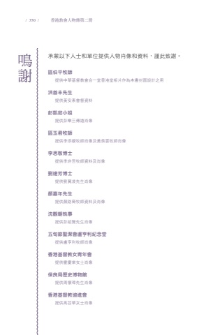 / 350 / 香港教會人物傳第二冊承蒙以下人士和單位提供人物肖像和資料,謹此致謝。區伯平牧師提供中華基督教會合一堂香港堂相片作為本書封面設計之用洪善丰先生提供黃安素會督資料彭凱茹小姐提供彭樂三傳道肖像區玉君牧師提供李添嬡牧師肖像及黃羨雲牧師肖像李思敬博士提供李非吾牧師資料及肖像劉達芳博士提供劉翼凌先生肖像顏嘉年先生提供顏路裔牧師資料及肖像沈觀朝執事提供彭紹賢先生肖像五旬節聖潔會盧亨利紀念堂提供盧亨利牧師肖像香港基督教女青年會提供霍慶棠女士肖像保良局歷史博物館提供周懷璋先生肖像香港基督教協進會提供高苕華女士肖像鳴謝