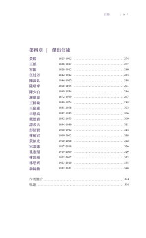 目錄 / ix /第四章 | 傑出信徒 黃勝 1825-1902 . . . . . . . . . . . . . . . . . . . . . . . . . . . . . . . . . . 274王韜 1828-1897 . . . . . . . . . . . . . . . . . . . . . . . . . . . . . . . . . . 277容閎 1828-1912 . . . . . . . . . . . . . . . . . . . . . . . . . . . . . . . . . . 280伍廷芳 1842-1922 . . . . . . . . . . . . . . . . . . . . . . . . . . . . . . . . . . 284陳藹廷 1846-1905 . . . . . . . . . . . . . . . . . . . . . . . . . . . . . . . . . . 288陸皓東 1868-1895 . . . . . . . . . . . . . . . . . . . . . . . . . . . . . . . . . . 291陳少白 1869-1934 . . . . . . . . . . . . . . . . . . . . . . . . . . . . . . . . . . 294謝纘泰 1872-1939 . . . . . . . . . . . . . . . . . . . . . . . . . . . . . . . . . . 297王國璇 1880-1974 . . . . . . . . . . . . . . . . . . . . . . . . . . . . . . . . . . 299王寵惠 1881-1958 . . . . . . . . . . . . . . . . . . . . . . . . . . . . . . . . . . 303卓恩高 1887-1985 . . . . . . . . . . . . . . . . . . . . . . . . . . . . . . . . . . 306戴恩賽 1892-1955 . . . . . . . . . . . . . . . . . . . . . . . . . . . . . . . . . . 309譚希天 1894-1980 . . . . . . . . . . . . . . . . . . . . . . . . . . . . . . . . . . 311彭紹賢 1900-1992 . . . . . . . . . . . . . . . . . . . . . . . . . . . . . . . . . . 314林植宣 1909-2002 . . . . . . . . . . . . . . . . . . . . . . . . . . . . . . . . . . 318黃汝光 1910-2008 . . . . . . . . . . . . . . . . . . . . . . . . . . . . . . . . . . 322宋常康 1917-2018 . . . . . . . . . . . . . . . . . . . . . . . . . . . . . . . . . . 326孔憲紹 1919-2009 . . . . . . . . . . . . . . . . . . . . . . . . . . . . . . . . . . 329林思顯 1922-2007 . . . . . . . . . . . . . . . . . . . . . . . . . . . . . . . . . . 332林思齊 1923-2010 . . . . . . . . . . . . . . . . . . . . . . . . . . . . . . . . . . 335聶錦勳 1932-2021 . . . . . . . . . . . . . . . . . . . . . . . . . . . . . . . . . . 340 作者簡介 . . . . . . . . . . . . . . . . . . . . . . . . . . . . . . . . . . . . . . . . . . . . . . . . . . . . . . . 344鳴謝 . . . . . . . . . . . . . . . . . . . . . . . . . . . . . . . . . . . . . . . . . . . . . . . . . . . . . . . . . . . . 350