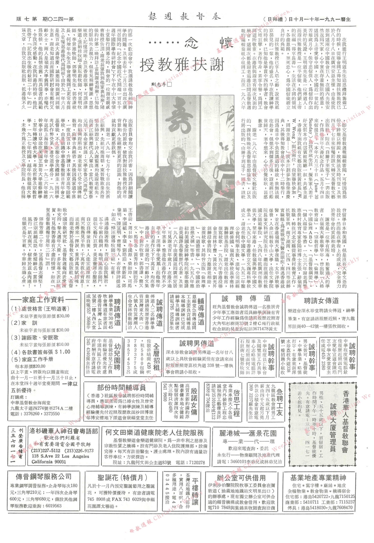 謝扶雅教授已享人瑞之齡,說來我祗算孫兒的一輩,他的盛名,早在我讀神學的時候,已知他是學貫中西的學者,教會文壇巨擘,著作等身,素享令譽,為同工同道所敬重。在港我與謝老有兩次見面的機會,這兩次都是謝老過港訪問基督教週報的編輯業組小組同工,而在一九八六年的那一次歡迎會中,我還請教他易經與神學的問題。及至去年十二月三日出席在廣州召開的「紀念中國近代史開端一百五十週年國際學術研討會」,下午在中山大學懷士堂舉行開幕之時,與會的一位謝老親戚曹教授告謂,謝老甚望我到他家裏相聚,隨後約好第二晚拜訪。當與謝老相聚,已知他的眼睛失去視力,但有見精神矍鑠,思想敏捷,記憶清晰,談及香港往事,可謂津津樂道,張紹桂牧師,黃耘蔚牧師、何世明牧師、李景雄牧師、鄧肇明先生、郭書謙校長、何增年先生及聯會週報同工更常有提及,並囑返港後代為問候。由於九一年六月是他百歲大壽榮慶,誠邀屆時到廣州同領主恩。謝老知道出席國際研討會有鄭何艾齡女士,兩人是嶺南大學舊同事,亦囑代為致候。他的長情念舊,所具儒者的風範,令我深受感動。在我回港的時候,他託我帶了「記我出生後的最初二十年」的一篇文章,由我交出版社出版。抵港後不久,卽交基督教週報編輯審閱,可惜因為部份字跡難以辨識,故無法及時刊登。及至四月十七日來信囑將該文轉交基督教文藝出版社,附在「自辮子至電子」一書出版,作為他百年大壽紀念作品。五月十四日來信提及:「本年六月三十日(June30Sunday)為我百歲生辰,擬集家人若干好友假本市白雲賓館餐廳一叙,共感主恩,香港方面我祗有文藝出版社黃社長(W. W. Wong)與兄兩位,尚望聯袂參加,同謝主恩……」我本計劃參加他榮壽慶典,其後得知餐會是在中午十二時舉行,因為是日中午負責講道的緣故,致無法親往赴會。但想不到個多月後,謝老經已離世歸天,至今想來,心中仍覺耿耿,甚感歉意。