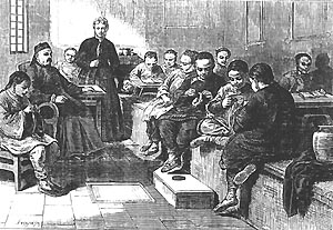 《倫敦新聞畫報》於一八七三年四月十九日刊登一幅北京女校的版畫,有謂這所北京女校是由倫敦傳道會負責人艾約瑟牧師(Rev. Joseph Edkins)的師母(Mrs Edkins)所主理。艾約瑟牧師於一八四八年由倫敦傳道會遣派到中國傳道,七月二日到達香港;隨即轉往上海;至一八六○年調往煙台;一八六三年入北京定居。艾約瑟牧師到北京可說是倫敦傳道會最早前往北京傳教的牧師。原因一八六○年中國與英法兩簽定北京條約之前,各國教士只准許在廣州、廈門、福州、寧波、上海五口岸傳教,而外國的使節是不可以進入北京開設使館處理外交事務,但自北京條約的簽定以後,外國使節固然可以在北京開設使館,派駐外交人員,而且北京亦可以成為外國教士傳教的地區。基督教以包爾騰牧師(Rev. John shaw Burdon)於一八六一年到北京為最早。艾約瑟牧師到了北京後不久,艾師母開設一所女書館,專收滿族女子入讀。從版畫所見,艾牧師是束長辮,戴中國帽子,女學生正在坑床上做針線和讀書的活動,女生只得十名,這是當年辦學作一種傳教工作。據報告有讀本、習字、算術、地理、音樂、縫紉、刺繡等科目的教導,使中國女子接受西式教育。