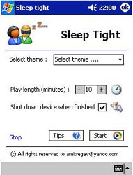 不過筆者今期介紹的一個 PDA(個人數位助理)軟體,能將一些大自然的聲音,帶到你的身旁,使你在聆聽時彷如置身在大自然景色中。軟體提供的聲音共有:River Stream、Small fire、Ocean sounds、Rain in forest、Rain and thunder等五種可選擇的聲音。若讀者有空的話,還可以自行加上另一些喜愛的聲音,只要將錄製好的聲音,放在 PDA "Program Files/Sleep Tight" 的資料夾中。當一切處理妥當,便可設定播放時間,找一個安靜地方,合起雙眼,靜靜寧聽這些大自然的聲音。或許這個時刻你可以禱告,又或許這個片刻是你沉醉入夢鄉的時間。無論如何能使你重獲精神,這種鬆弛你壓力的時刻,該是絕妙不容放過的時刻啊!