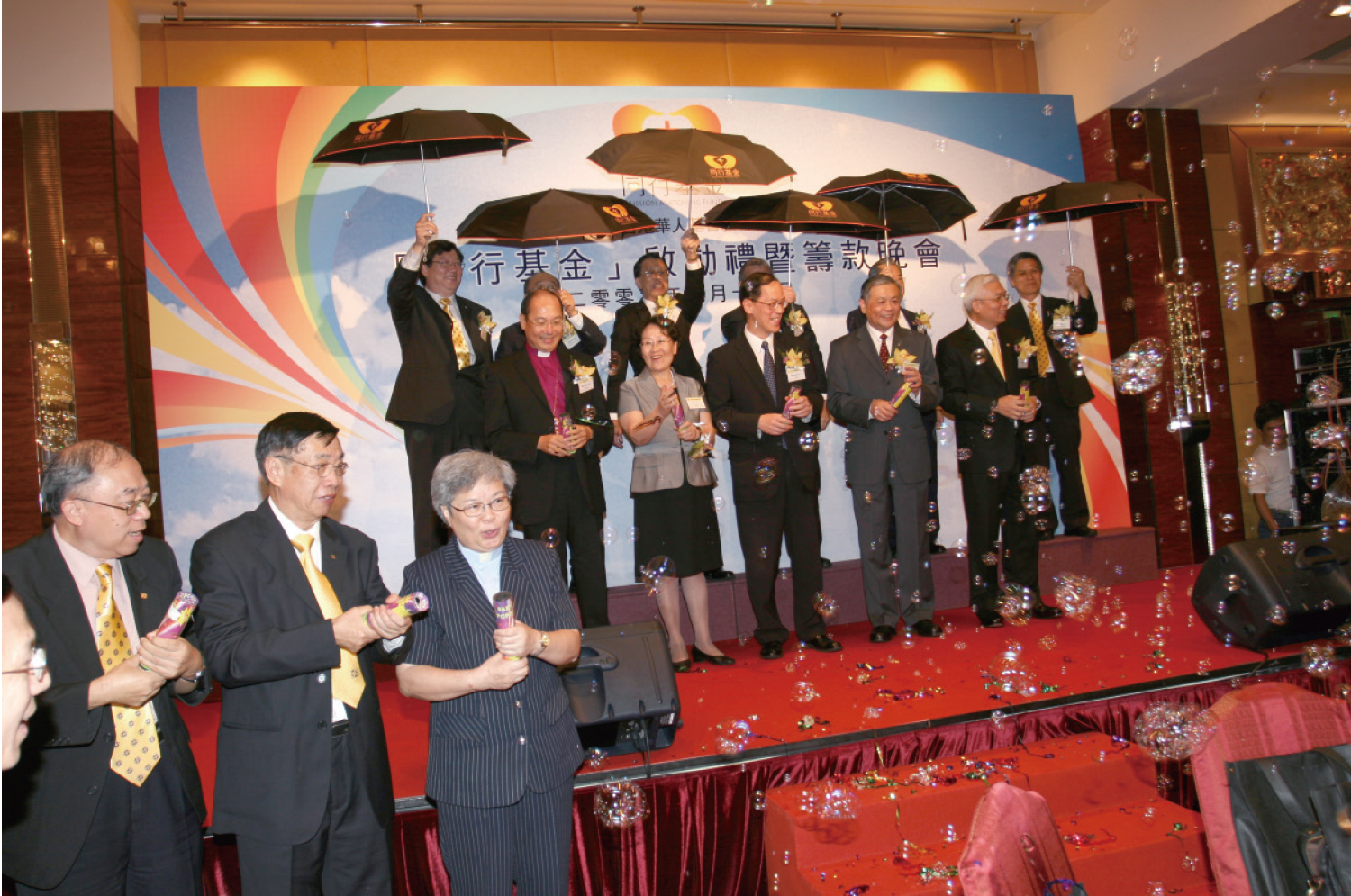 ▲在二零零九年九月十一日的同行基金啟動儀式上,各位嘉賓撐傘寓意與前線機構風雨同行。