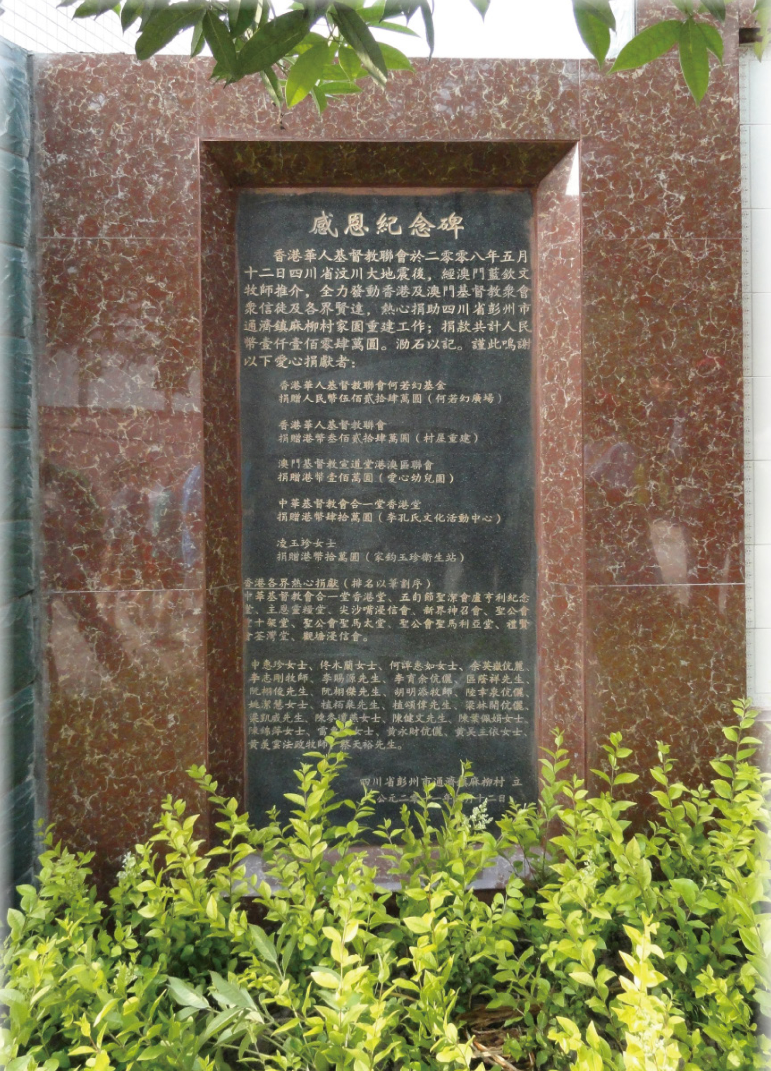 ▲在四川設立感恩紀念碑,感謝聯會捐助四川彭州市通濟鎮麻柳村的重建工作。