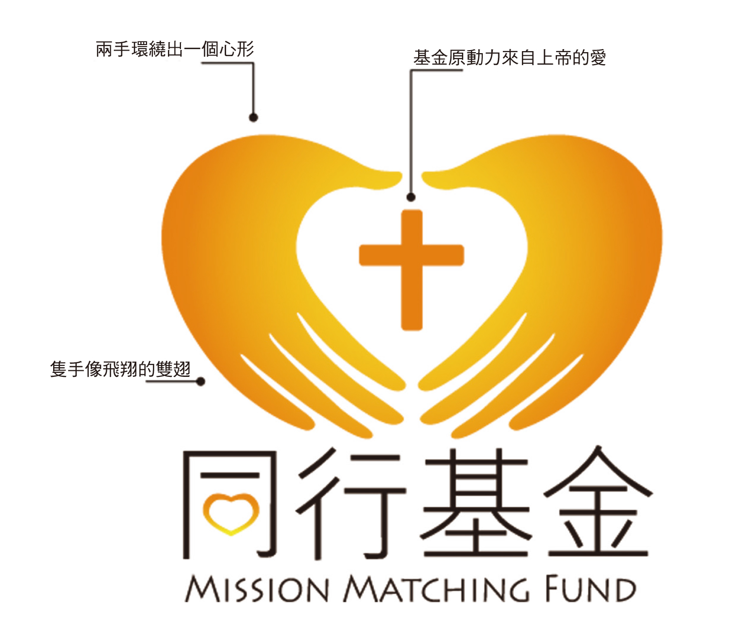 雙手像飛翔的雙翅,象徵風雨同行的概念。兩手環繞出一個心形,傳達同心同行的寓意。心形中的十字架,表示基金的原動力乃來自上帝的愛。整個標誌採用漸變的橙黃色,象徵上帝的光明與其施予世人的溫暖。
