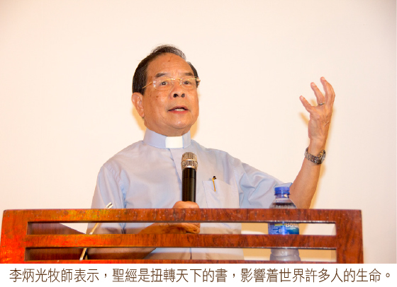 李牧師表示,聖經的撰寫,乃由在主前一千五百年至主後一百年,其超越了時間、空間、不分階級、種族,作者包括:皇帝、先知、漁夫、醫生等等,他們互不認識,但寫的東西卻是一貫的,都是寫上帝的愛。李炳光牧師分享,聖經是生命之道,能改變人的生命。他在多年前讀神學時,被派到婆羅洲服侍曾砍人頭的伊班族土人,親眼目睹在他們的家門前掛着人頭,後來因信主而改變。「上帝的道是活潑的,是有功效的,比一切兩刃的劍更快,甚至魂與靈,骨節與骨髓,都能刺入、剖開,連心中的思念和主意都能辨明。」(來四12)李牧師在總結時鼓勵信徒:「盼望這本扭轉天下的書,你也可以擁有一本聖經,並成為自己隨身的行李,期望大家可以欣賞、學習、配合及運用聖經,讓生命之道成為生命之道,成為你的書!」
