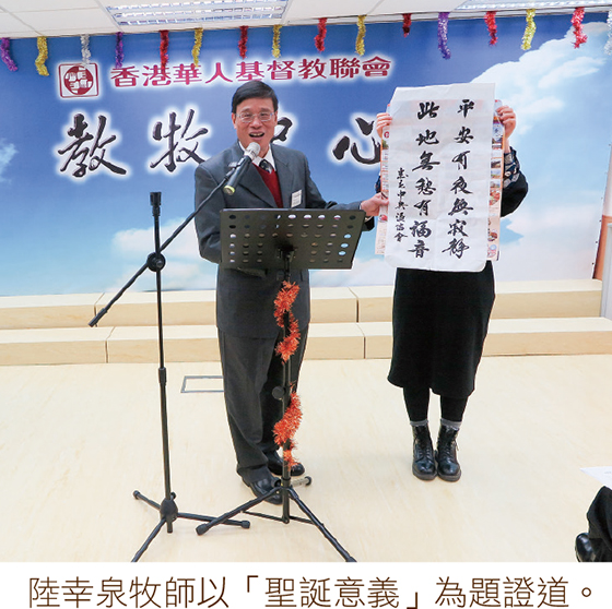 是次聖誕音樂崇拜,在詩班獻詩《小聖嬰》及《齊來,信主聖徒》後,由聯會總幹事陸幸泉牧師帶領各位歌唱由路加福音二章八至十四節經文編寫而成的《基督降生、給你平安》,並以「聖誕意義」為題證道。陸牧師指出,第一批前去敬拜主耶穌的是當時地位卑微的牧羊人,耶穌選擇卑微地在馬槽出生,成為人類的救世主,拯救人脫離死亡。陸牧師又分享著名詩歌《彌賽亞》的作曲者創作的經歷與聖誕樹的源由均指出,主耶穌才是人類的救主。