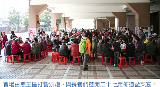 慈王區佈道會講者柳鎮平牧師亦分享福音信息,他說自己能有健康的身體,全靠平日多做運動及常常喜樂,更笑言要「隻眼開,隻眼閉」,凡事看開,不計較事情。「我的人生目標是帶領所有親戚朋友信耶穌。」他續說,慈王區作為今屆分區佈道事工第一站,希望未來能見到區區街坊信耶穌,他隨即呼召在場長者決志信主,並謂信主後將來在天上有另一國度,是讓人滿有希望的國度。隨後,大會筵開二十七席,與眾長者共享盆菜宴。