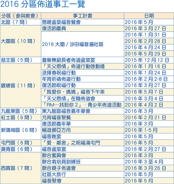 傳道部原定選出五個區份參與「2016分區佈道事工」,但經審批後決定選出十個合資格區份。陳牧師直言,申請區份過去多曾參與分區報佳音,已有一定經驗和網絡,申請條件亦完全符合要求,因此小組決議增至支持十區。獲批之區份包含北區、大圍區、慈王區、觀塘區、九龍東區、紅土區、新蒲崗區、屯門區、葵青區、西貢區,合共有六十九間教會參與其中。