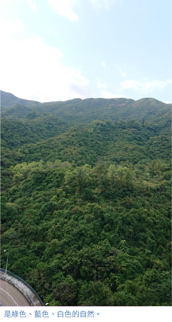 家住的大厦座落在郊野公園旁邊,窗戶西南向山。清早起來,常常映進眼簾的,是翠翠綠綠、層層叠叠、蔥蔥郁郁的樹海山坡。清風徐來,吹藍了天空,浮泛起幾片疏落的輕淡白雲,逍遙閒盪在嫩暖的陽光中,是綠色、藍色、白色的自然,是潔淨的色彩,抹去了鬧市的浮塵,令人心境曠達。皺蹙暗黑滿蓋烏雲的日子當然也會遇上,但畢竟不多。