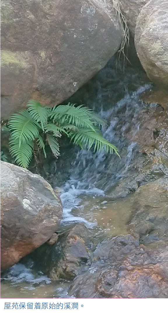 另一獨特之處,屋苑是填平一個水塘依山建成的,保留着原始的溪澗和引水道。夏天大雨時,潺潺流水,瞬間便從各引水道滙流成水花飛濺,嘩啦嘩啦激盪澎湃的急流,奔騰咆哮,彷如轟轟的瀑布就在你面前,響聲震動籠罩整個屋苑。