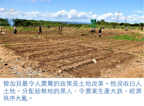 穆加貝最令人震驚的政策是土地改革。他沒收白人土地,分配給無地的黑人,令農業生產大跌,經濟秩序大亂,不但趕走白人,也趕走外資,把國家推下貧窮黑洞。