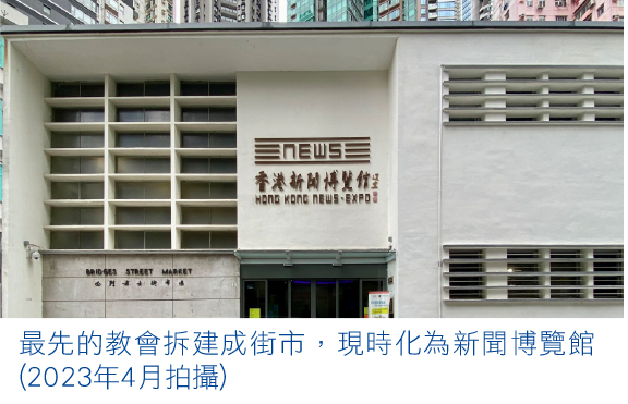 位於中環半山的「香港新聞博覽館」,是由廢置多年的必列啫士街街市改造而成。場館外牆的行人道上,豎有一個紀念裝置;原來這處是「孫中山史蹟徑」第4站,這裏最早期是美國公理會的福音堂,孫中山曾在福音堂寄住,也在這裏聽道歸信,於1883年領受水禮。紀念裝置有如一份向公眾展開的「見證單張」,讓路過行人清晰閱讀這段史蹟。