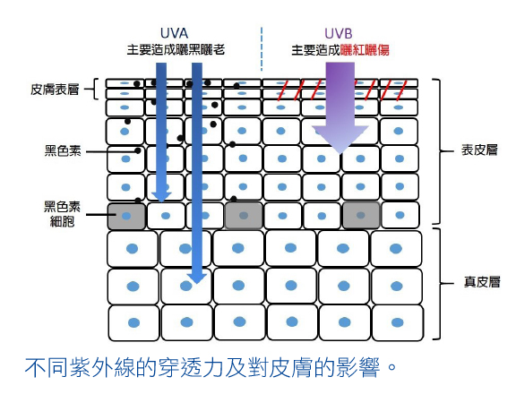 陽光裏的紫外線,UVC波長最短(100-280nm),能被地球的大氣層完全阻隔,除非大氣層變薄或有洞,如十多年前南極上空的臭氧層。剩下有5% UVB (波長280-315nm) 及95%UVA (波長315-400nm) 能到達地面。當中UVA 有較佳的生物穿透能力,所以能到達皮膚較深層的真皮層,影響細胞。長時間照射會造成皮膚變黑,甚至老化。而UVB 因波長較短,能量較高,雖只能到達表皮層,長時間暴露會令皮膚曬紅及曬傷。