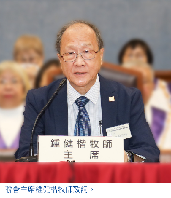 主席鍾健楷牧師致詞時指出,今日世界烽煙四起戰爭激烈,令致人心惶惶。他引申馬太福音二十四章,門徒在橄欖山上問耶穌末世何時到?世代終結有甚麼預兆?耶穌形容當時世代是危險的年代,與今日的光景相似。但有危就有機,重要的是轉化過程,不要驚慌,只要堅忍到底終必得救,並且要把握機會將福音傳遍天下,擴展上帝國度。