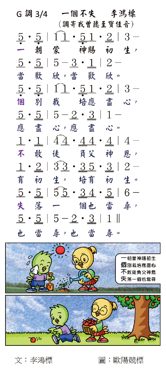 我們也當緊記,「一個不失」,對我們來說是無可能的事!但不要忘記,上帝只要求我們盡所能,祂便會為我們成就那些無可能的事。還記得「五餅二魚」的神蹟嗎?當那位小孩「盡所能」,將自己所有的食物全然交給耶穌基督,祂便藉此成就了那「無可能」的神蹟:以五餅二魚吃飽了五千人(男丁的人數)。