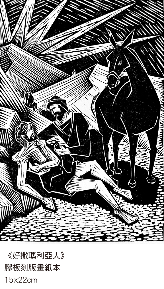 其實,我希望在這一幅版畫中穿越歷史。歷史之中,戰爭不斷,這一個爆炸,可以是過去、現在、或是未來。無論是在那一個時點,好撒瑪利亞人的故事依然是耶穌基督給予我們的,直至現在,我們還未做到,正因如此,我們就更見其永恆的價值了。阿們。