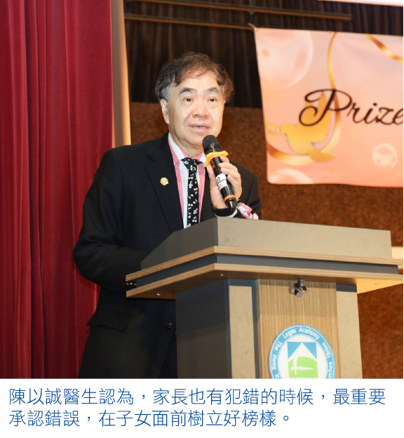 香港華人基督教聯會真道書院已於12月9日,於該校舉行「2023頒獎典禮」,分別頒發獎項予小學部及中學部學生,表揚他們過去一年在學業、品德及各類型比賽上的優異表現。香港醫學會前副會長、香港醫學會現任會董陳以誠醫生指,家長應了解子女的本質和需要,如犯錯必須承認錯誤,在孩子面前作好榜樣。