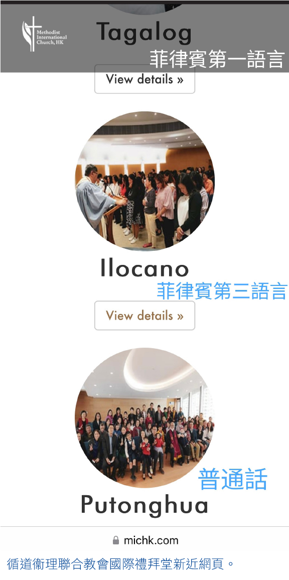 原初的英語循道會在這項「第二重國際化」服侍發展中也不遑多讓。除了既有的英語聚會及新設的普通話聚會,堂會更十分用心地開設了菲律賓兩種方言的聚會。教會留意覺察,菲律賓女傭中多是操菲國主要的 Tagalog 語的,可是還有不少是操菲國第三的 Ilocano 語的。於是分別都設立了聚會。堂會新定名為「國際禮拜堂」,絕對名實相副。