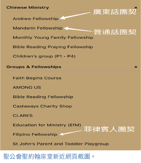 聖公會聖約翰座堂一馬當先,既早已設立菲律賓人團契;在香港回歸中國的年日,更開設普通話主日崇拜,又另設有廣東話團契及普通話團契。這間原初的「國家教會」,現時已經是一間「兩文三語」的香港本地堂會。